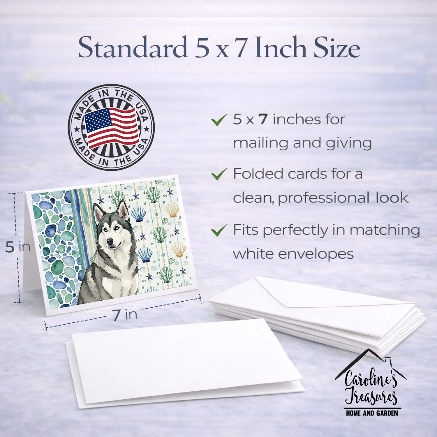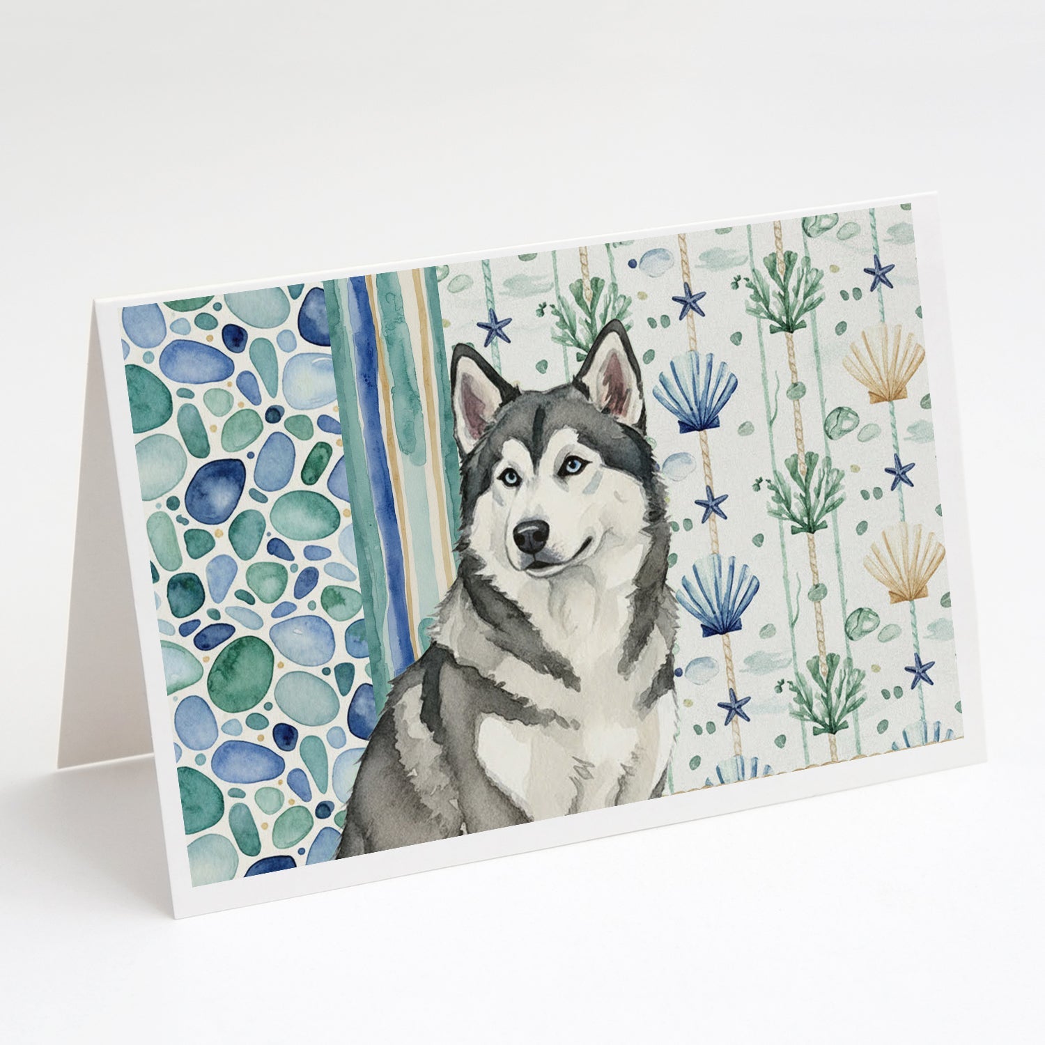 Shown here is the Gray and White Alaskan Malamute Coastal Sea Glass Greeting Cards Pack of 8 from Caroline's Treasures featuring artwork of a Alaskan Malamute in a Everyday design. The detailed illustration and vibrant colors make it a standout accent that celebrates both seasonal style and love for the subject. This image features a calming coastal watercolor pattern with soft seashells, seaweed, starfish, and pebble-inspired accents arranged in a repeating design. The soothing palette of blues, greens, and sandy neutrals creates a relaxed, beach-inspired look that adds a fresh and tranquil feel to any space. Everyday décor celebrates personal style and the small moments that make a house feel like home. Thoughtful designs add warmth and personality that can be enjoyed year-round. Celebrate special moments with Caroline's Treasures Printed Greeting Card Pack. This pack includes eight beautifully folded 5x7 cards, accompanied by eight matching white envelopes. With blank interiors, these cards provide ample space for your personalized messages and heartfelt holiday greetings. Each card features captivating full-color artwork, meticulously printed in our facility on high-quality 80 lb cover stock or 216 GSM. The super smooth finish of the white cards enhances the visual impact of the artwork, creating a truly stunning presentation. Designed by our talented in-house artists or licensed artists, the artwork on these cards showcases their creativity and attention to detail. From vibrant illustrations to captivating designs, each card tells its own unique story. Whether it's for birthdays, anniversaries, holidays, or any special occasion, Caroline's Treasures Greeting Card Pack is the perfect way to convey your heartfelt sentiments. Share joy, love, and warm wishes with these exquisite cards and make every moment unforgettable. Perfect for: Writing personal messages, everyday correspondence, and thoughtful notes, Dogs-themed stationery collections, or year-round use for Alaskan Malamute lovers. Alaskan Malamutes are strong working dogs known for their endurance, loyalty, and friendly disposition. Bred for hauling and cold climates, this powerful northern breed is cherished for its affectionate nature and impressive strength. Makes a heartfelt gift for: Alaskan Malamute owners, Dogs lovers, Everyday gifts, pet parents, friends who adore their Alaskan Malamute, or anyone celebrating Dogs.
