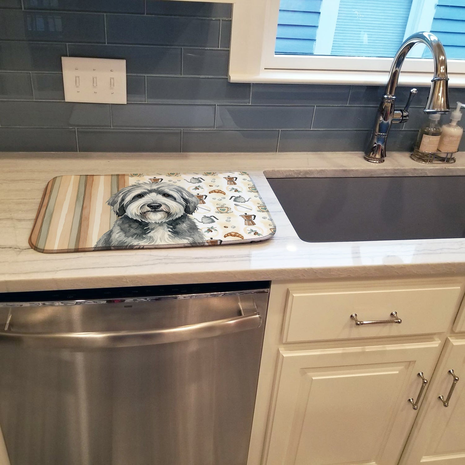 Shown here is the Gray and White Old English Sheepdog Coffee Bar Dish Drying Mat from Caroline's Treasures featuring artwork of a Old English Sheepdog in a Everyday design. The detailed illustration and vibrant colors make it a standout accent that celebrates both seasonal style and love for the subject. This image features a cozy watercolor coffee-themed pattern with illustrated mugs, moka pots, kettles, croissants, coffee beans, and sugar cubes arranged in a repeating design. Soft neutral tones with warm browns, creams, and subtle sage accents create an inviting, café-inspired look that feels comforting and relaxed. Everyday décor celebrates personal style and the small moments that make a house feel like home. Thoughtful designs add warmth and personality that can be enjoyed year-round. Say goodbye to messy countertops and soggy dish towels with our innovative dish drying mat. Our high-quality dish drying pad is designed to keep your countertops dry while offering a stylish and efficient solution. Whether you're air drying dishes, glasses, stemware, silverware, pots, pans, bottles, or even fruits and vegetables, our dish mat is the perfect choice. The 14 inches x 21 inches size fits most counters and dish drying racks, and the non-slip design ensures stability. Made with water-absorbent polyester and a polyurethane foam insert, our dish drying mat is not only functional but also durable. It's machine washable and printed in the USA for long-lasting use. The beautiful artwork adds flair to your kitchen decor, making it a perfect housewarming gift or present for any occasion. Upgrade your kitchen experience with our absorbent and versatile dish drying mat. Perfect for: Kitchen counters and sinks, everyday dish drying and countertop protection, Dogs-themed homes, or year-round use for Old English Sheepdog lovers. Old English Sheepdogs are large herding dogs known for their shaggy coats and gentle temperament. This iconic breed is cherished for its loyalty, intelligence, and family-oriented nature. Makes a heartfelt gift for: Old English Sheepdog owners, Dogs lovers, Everyday gifts, pet parents, friends who adore their Old English Sheepdog, or anyone celebrating Dogs.