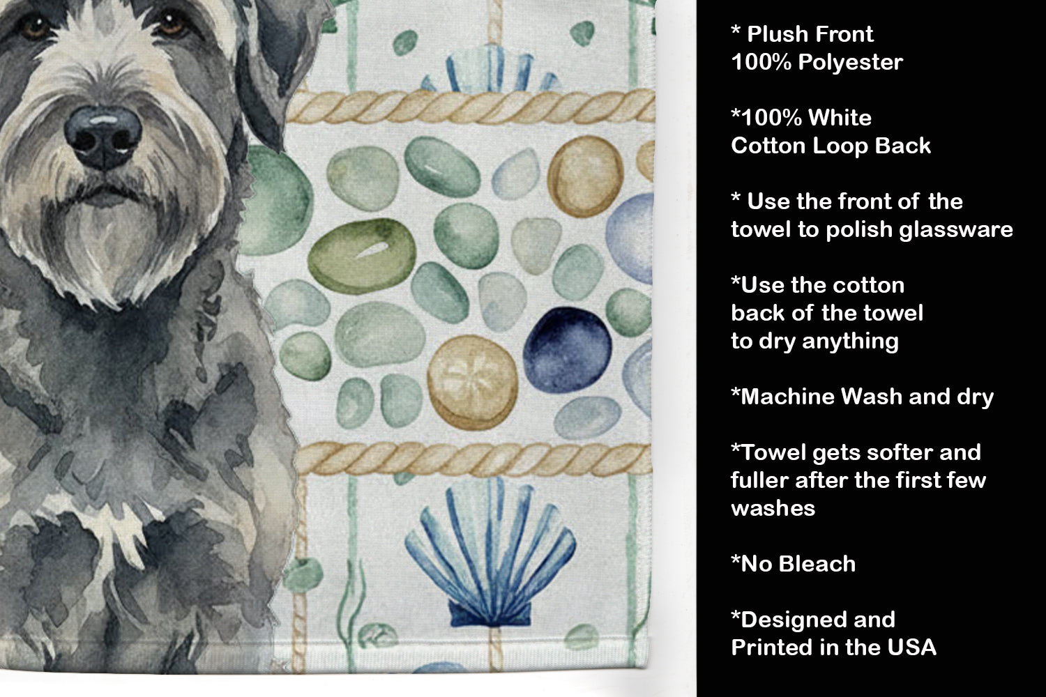 Kitchen Towel featuring breed specific Bouvier des Flandres artwork. Bring breezy coastal charm to your kitchen or bath with our plush velour towel featuring original watercolor artwork. The soft minky polyester front showcases vivid seashell and starfish designs with a dog portrait, perfect for polishing glassware to a brilliant shine. The 100% cotton terry loop back delivers superior absorbency for drying hands, dishes, or counters. Artwork is dyed directly into the fibers for lasting color that won’t crack or peel. Each towel measures 15" x 25", with bound edges to maintain shape after repeated washes. Machine washable and tumble dry low for easy care. Designed and printed in the USA, these towels combine function and style—ideal for beach homes, coastal kitchens, or as thoughtful gifts.