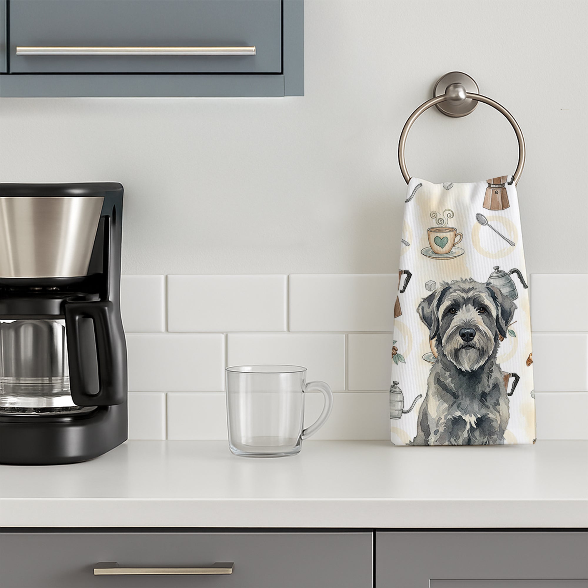 Kitchen Towel featuring breed specific Bouvier des Flandres artwork. Start your morning with charm and function thanks to our Coffee Time Kitchen Towel Collection. Featuring playful watercolor artwork of coffee pots, cups, croissants, and a dog portrait, these towels bring warmth and personality to your kitchen or bath. Crafted with a plush minky polyester front that polishes glassware to a shine, and a 100% cotton terry loop back for absorbency, they combine durability with practicality. Artwork is permanently dyed into the fibers to keep colors fresh wash after wash. Measuring 15" x 25", these machine-washable towels are finished with bound edges to hold their shape. Designed and printed in the USA, they’re perfect for kitchens, coffee bars, guest baths, or as thoughtful gifts for dog lovers and coffee enthusiasts alike.