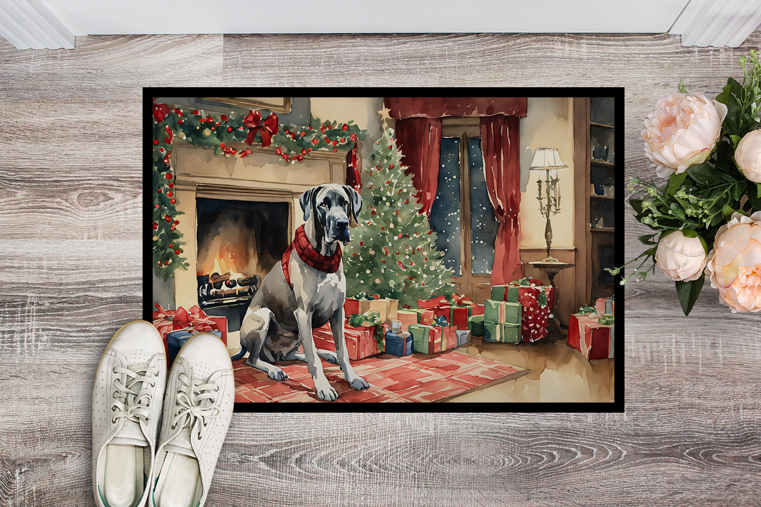 Decorate your space with our Christmas Great Dane artwork on a Doormat. Welcome your guests in style with our Artwork Door Mat, designed to withstand almost any weather condition. This mat, measuring approximately 24 by 36 inches, is held together by durable black binding tape. Its top layer, composed of polyester felt, is dyed with the eye-catching image you see on the mat. A few layers below provide the mat with stability, while its rubber bottom is stamped to help prevent slipping and ensures safety. Our mat works wonderfully as both an indoor or outdoor door mat. For cleaning, simply hose it off with water or use a power washer - no need for any cleaner that produces suds. Avoid scrubbing with a brush, instead, opt for the vacuum on floor setting. Designed manufactured and printed in the USA, this mat is a perfect addition to your porch, outdoor kitchen, entryway, or any indoor space. Its unique design makes it a charming decorative rug that greets your guests and adds a stylish touch to your home decor.