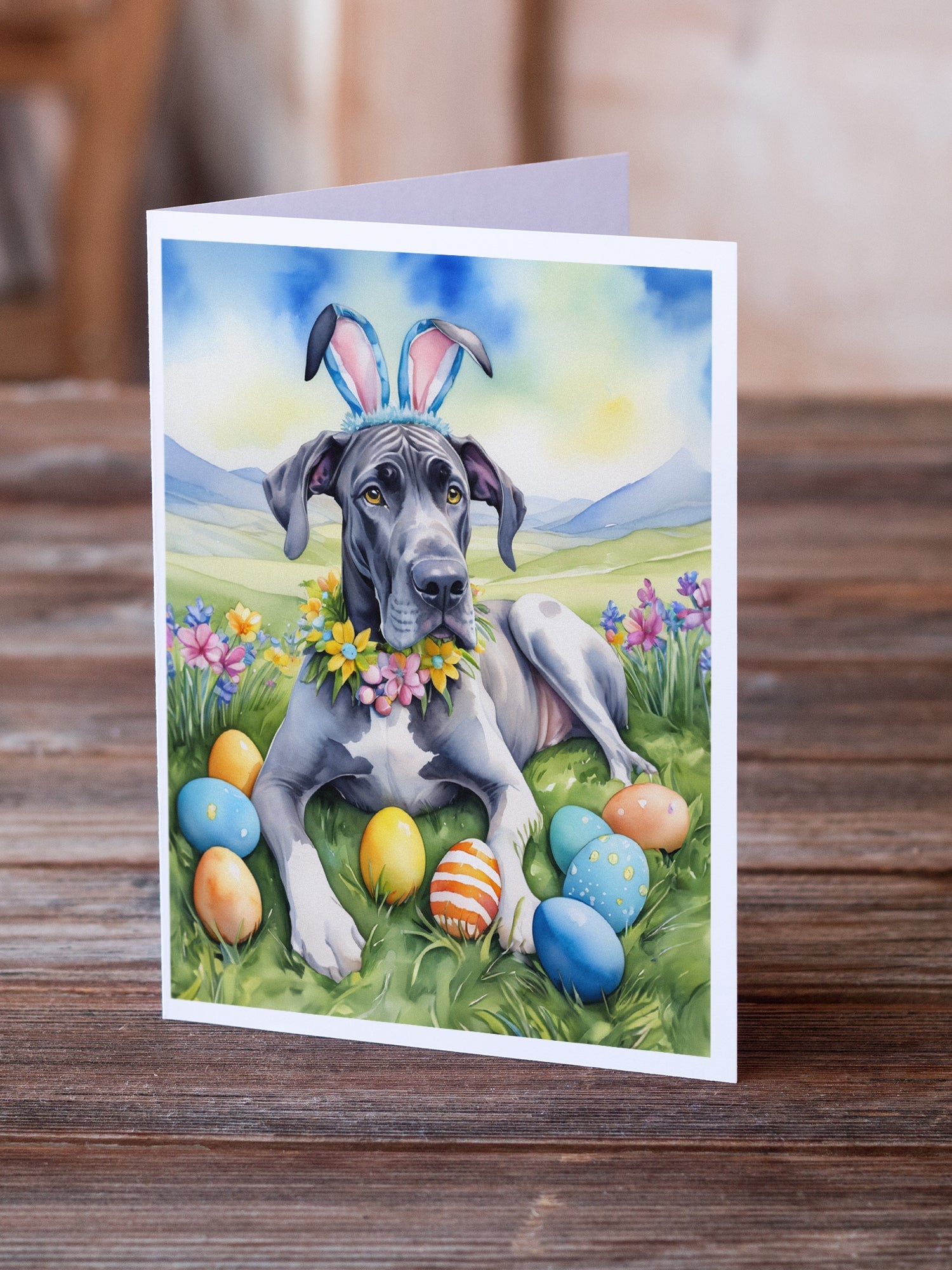 Decorate your space with our Easter Great Dane artwork on a . Celebrate special moments with Caroline's Treasures Printed Greeting Card Pack. This pack includes eight beautifully folded 5x7 cards, accompanied by eight matching white envelopes. With blank interiors, these cards provide ample space for your personalized messages and heartfelt holiday greetings. Each card features captivating full-color artwork, meticulously printed in our facility on high-quality 80 lb cover stock or 216 GSM. The super smooth finish of the white cards enhances the visual impact of the artwork, creating a truly stunning presentation. Designed by our talented in-house artists or licensed artists, the artwork on these cards showcases their creativity and attention to detail. From vibrant illustrations to captivating designs, each card tells its own unique story. Whether it's for birthdays, anniversaries, holidays, or any special occasion, Caroline's Treasures Greeting Card Pack is the perfect way to convey your heartfelt sentiments. Share joy, love, and warm wishes with these exquisite cards and make every moment unforgettable.