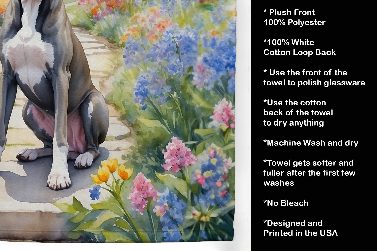 Decorate your space with our Great Dane artwork on a Kitchen Towel. Bring a bit of Spring into your home with a Spring Kitchen Towel. Experience the perfect blend of aesthetic appeal and functional excellence with our Plush Velour Kitchen Towels. These are not your ordinary decorative kitchen towels that gather dust. Instead, they are designed to be as practical as they are stylish. The front layer of our towel is constructed from a minky plush polyester, known for its durability and color retention. Unlike conventional kitchen towels, the artwork on our towels is dyed directly into the fabric, ensuring vibrant colors that last. Polish your glassware to a brilliant sparkle using the plush front side of the towel. Flip to the back, crafted from 100% cotton terry loop, to exploit its exceptional absorbency for drying dishes or wiping down counters. Our kitchen towels redefine the concept of functional art, offering lasting quality that maintains the towel's shape over time. Measuring 15 inches by 25 inches and weighing 2.3 lbs per dozen, these towels deliver an overwhelming sensory experience with their soft, plush, and smooth texture. The edges are meticulously finished with binding, enhancing their durability and visual appeal. For your convenience, these towels are machine washable and can be dried on low heat. After the first wash, the top fabric becomes even softer and fluffier, eliminating the need for ironing. Treat your kitchen to the luxury and functionality it deserves with our plush velour kitchen towels.