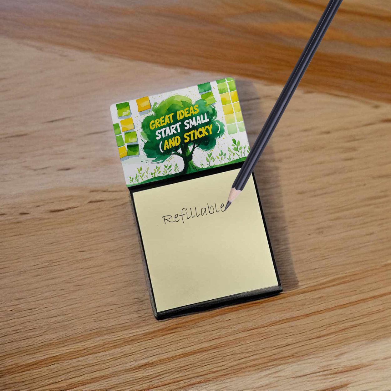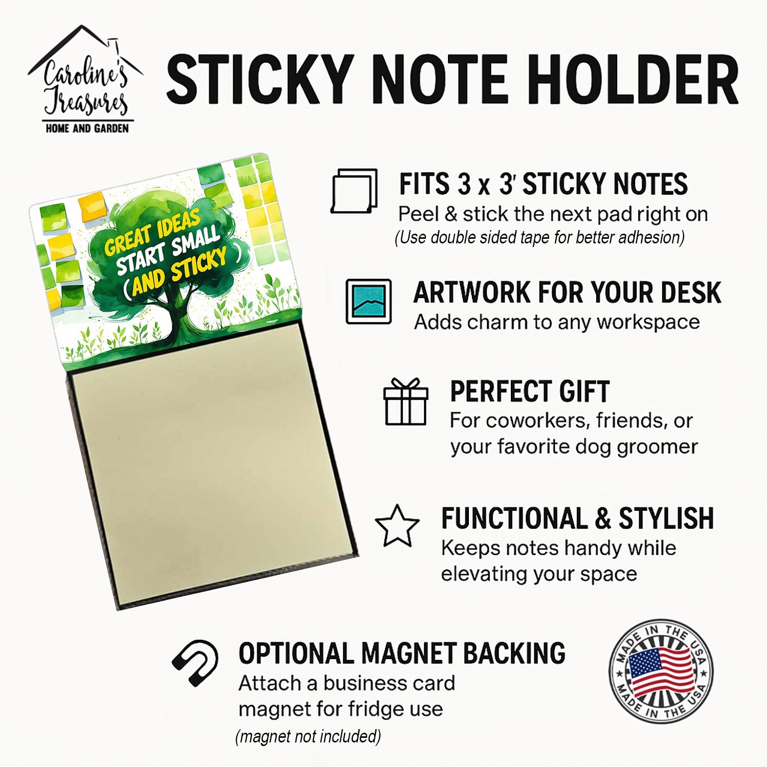 Add personality and function to your workspace with this funny sticky note holder from Caroline’s Treasures. Proudly made in the USA, it features the witty phrase - Great Ideas Start Small and Sticky - in bold, vibrant watercolor art, turning an everyday desk accessory into a conversation starter. The sturdy base keeps your sticky notes in place while you write, and the permanently mounted aluminum art plate offers a glossy, durable, fade-resistant finish. This refillable sticky note dispenser fits standard 3" x 3" pads, making it easy to keep your notes within reach. To refill, simply roll a small piece of tape around your finger, press it to the back sheet of a new pad, and attach it to the board — ready for your next brilliant idea. Perfect for offices, classrooms, nurse stations, or home desks, this note holder makes a thoughtful and practical gift for coworkers, teachers, nurses, students, and friends. For even more flexibility, add an optional business-card-size magnet (sold separately) to mount it on your fridge or any magnetic surface.
