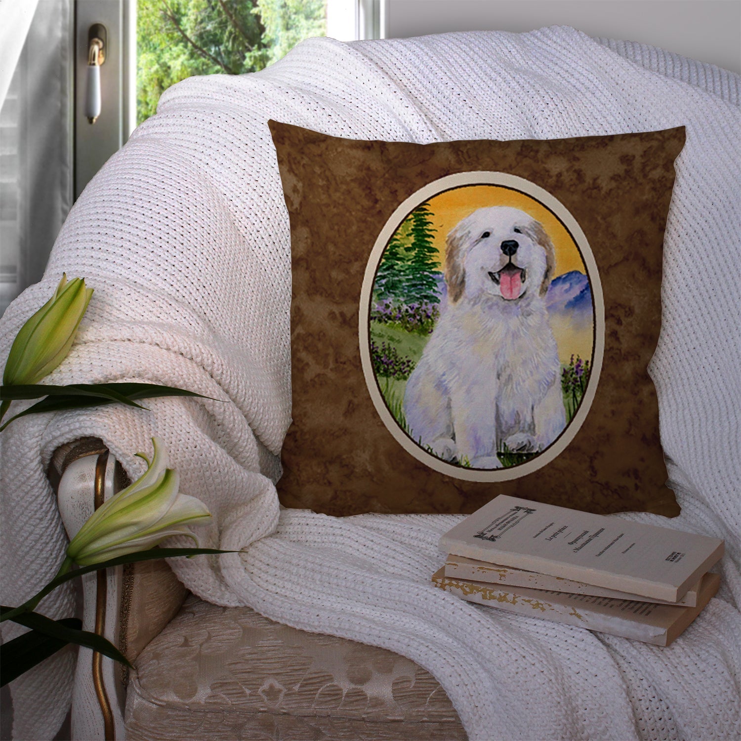 Decorate your space with our Great Pyrenees artwork on a Pillow. Add a touch of vibrancy and comfort to your outdoor seating with Caroline's Treasures Fabric Decorative Pillow. Measuring approximately 14 inches by 14 inches, this outdoor pillow is crafted to elevate the appeal of your patio furniture, infusing it with vivid color and artistic flair. The pillow includes a 100% Polyester Fabric sham filled with a quality pillow form to provide superior comfort. Innovatively made from our brand new material, specifically woven for its water resistance, this pillow is designed for durability. The soft canvas fabric offers versatility in use, fit for your indoor couch or your outdoor patio, porch, or veranda. The fabric is dyed with colorfast dyes built for resilience against weather conditions, ensuring the pillow retains its beauty over time. Constructed by sewing three fabric pieces to create a sham, the polyester insert is then nestled inside to form the pillow, resulting in an overstuffed pillow that maintains its shape. Both the sham and the pillow insert are proudly made in the United States. As the pillows are handcrafted, there may be minor variations in size, further enhancing their unique charm. Experience comfort in style with Caroline's Treasures Fabric Decorative Pillow.