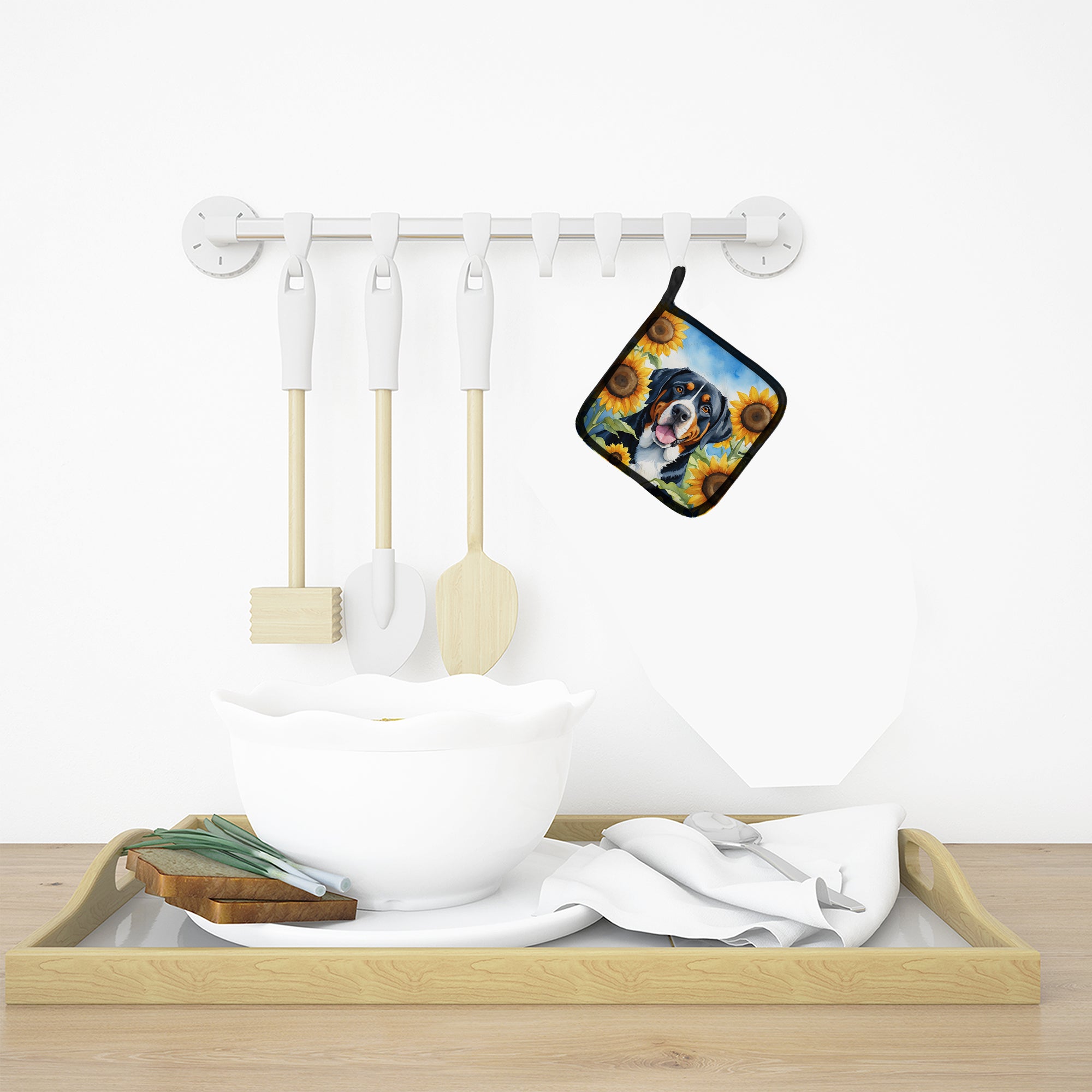 Decorate your space with our Greater Swiss Mountain Dog artwork on a Pair of Pot Holders. Bring a bit of Summer into your home with a Summer Pair of Pot Holders. A Pair of Pot Holders to match your kitchen decor. Made in the USA these are thick and functional. Full color artwork decorates the front polyester fabric of the hot pad and accented by a black trim. Use these at as a trivet for your Thanksgiving or Christmas tablescape. Filled with insulated fabric and quilted for durability. These colorful pot holders will make a great gift for your favorite home cook or executive chef. Each pot holder measures approximately 7 1/2 inches by 7 1/2 inches. A hanging tab is included.