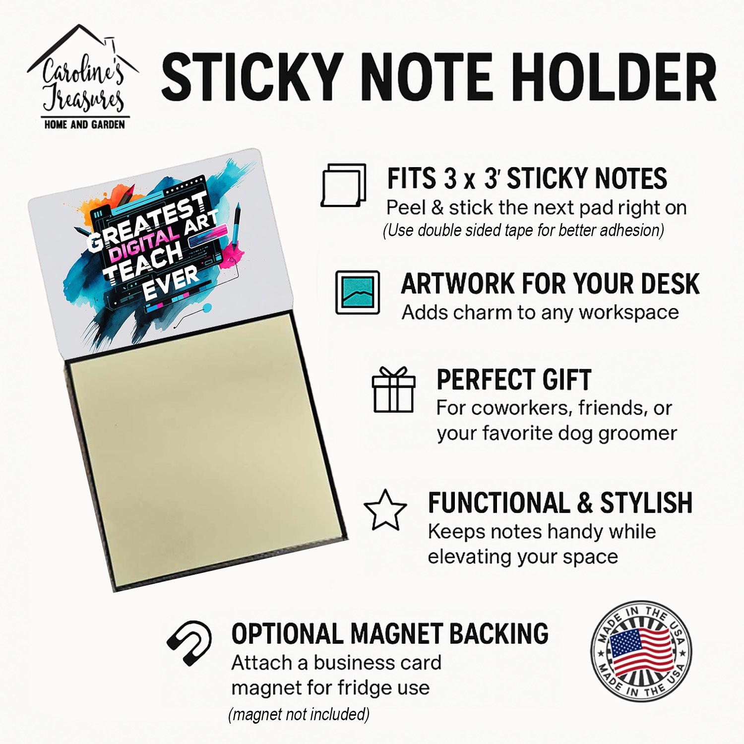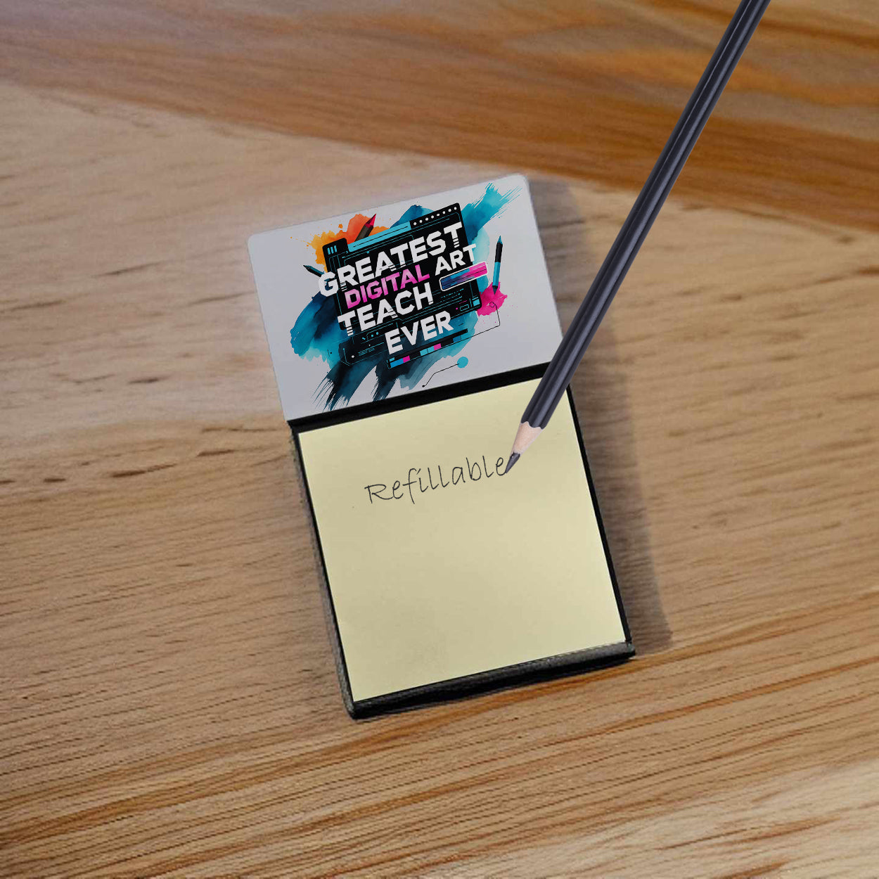 Celebrate the educators who inspire every day with this funny teacher sticky note holder from Caroline’s Treasures. Proudly made in the USA, each design features the phrase Greatest Digital Art Teacher Ever - in bold, colorful artwork that turns an everyday desk accessory into a thoughtful gift. The sturdy base holds 3" x 3" sticky notes securely while you write, and the glossy aluminum art plate adds a durable, fade-resistant finish that lasts. Refilling is easy—just roll a piece of tape around your finger, press it to the back sheet of a new pad, and attach it to the board. Ideal for classrooms, offices, or home desks, these note holders make a meaningful gift for Teacher Appreciation Week, back-to-school, end-of-year celebrations, or simply saying thank you.