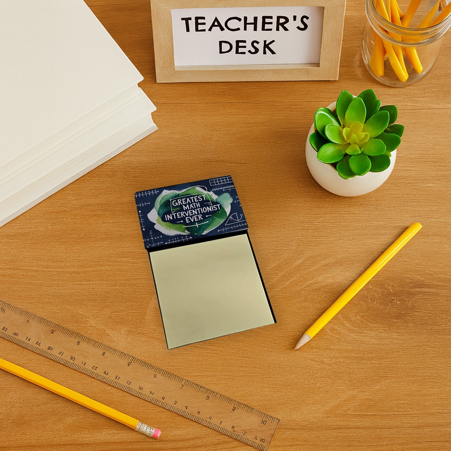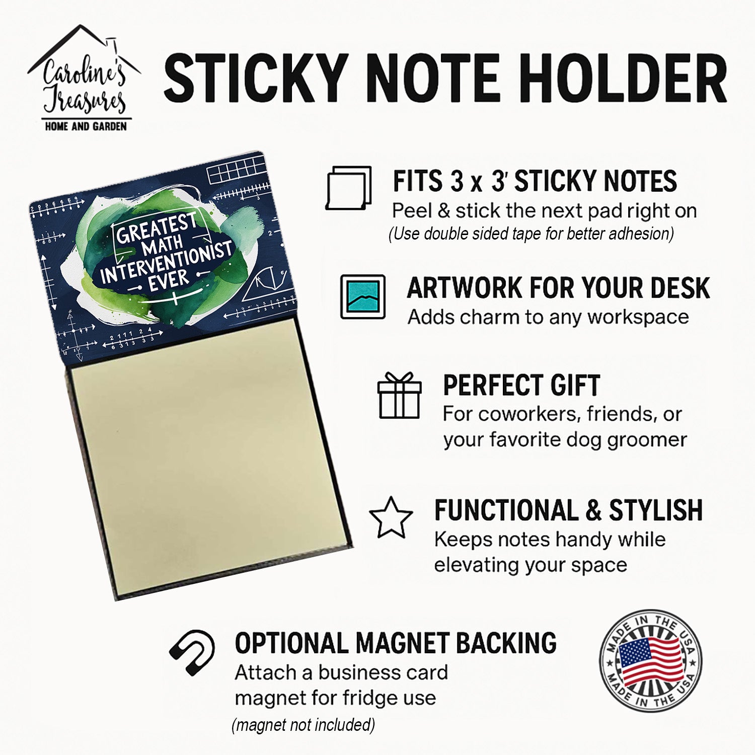 Celebrate the educators who inspire every day with this funny teacher sticky note holder from Caroline’s Treasures. Proudly made in the USA, each design features the phrase Greatest Math Interventionist Ever - in bold, colorful artwork that turns an everyday desk accessory into a thoughtful gift. The sturdy base holds 3" x 3" sticky notes securely while you write, and the glossy aluminum art plate adds a durable, fade-resistant finish that lasts. Refilling is easy—just roll a piece of tape around your finger, press it to the back sheet of a new pad, and attach it to the board. Ideal for classrooms, offices, or home desks, these note holders make a meaningful gift for Teacher Appreciation Week, back-to-school, end-of-year celebrations, or simply saying thank you.