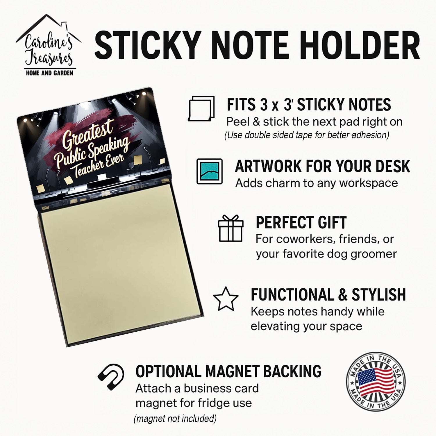 Celebrate the educators who inspire every day with this funny teacher sticky note holder from Caroline’s Treasures. Proudly made in the USA, each design features the phrase Greatest Public Speaking Teacher Ever - in bold, colorful artwork that turns an everyday desk accessory into a thoughtful gift. The sturdy base holds 3" x 3" sticky notes securely while you write, and the glossy aluminum art plate adds a durable, fade-resistant finish that lasts. Refilling is easy—just roll a piece of tape around your finger, press it to the back sheet of a new pad, and attach it to the board. Ideal for classrooms, offices, or home desks, these note holders make a meaningful gift for Teacher Appreciation Week, back-to-school, end-of-year celebrations, or simply saying thank you.