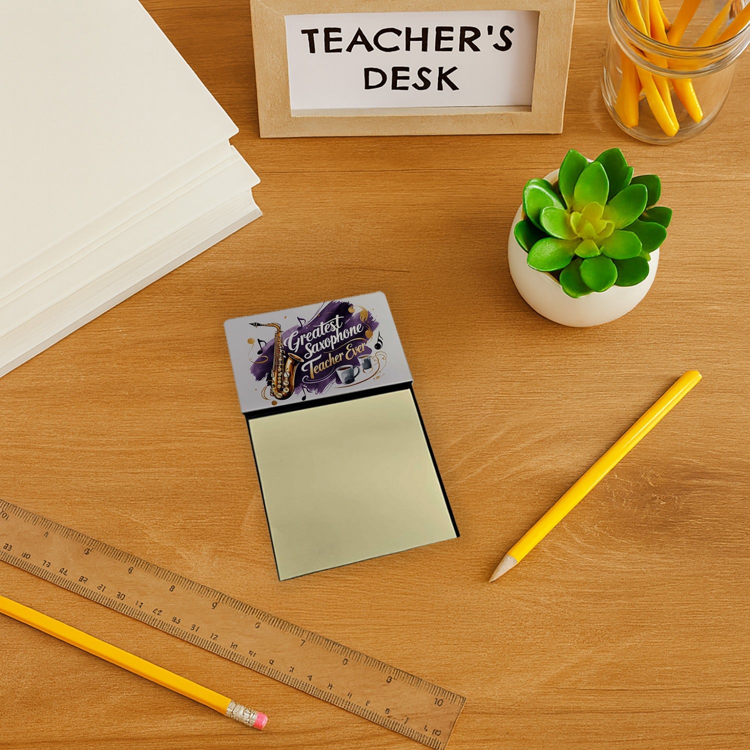 Celebrate the educators who inspire every day with this funny teacher sticky note holder from Caroline’s Treasures. Proudly made in the USA, each design features the phrase Greatest Saxophone Teacher Ever - in bold, colorful artwork that turns an everyday desk accessory into a thoughtful gift. The sturdy base holds 3" x 3" sticky notes securely while you write, and the glossy aluminum art plate adds a durable, fade-resistant finish that lasts. Refilling is easy—just roll a piece of tape around your finger, press it to the back sheet of a new pad, and attach it to the board. Ideal for classrooms, offices, or home desks, these note holders make a meaningful gift for Teacher Appreciation Week, back-to-school, end-of-year celebrations, or simply saying thank you.