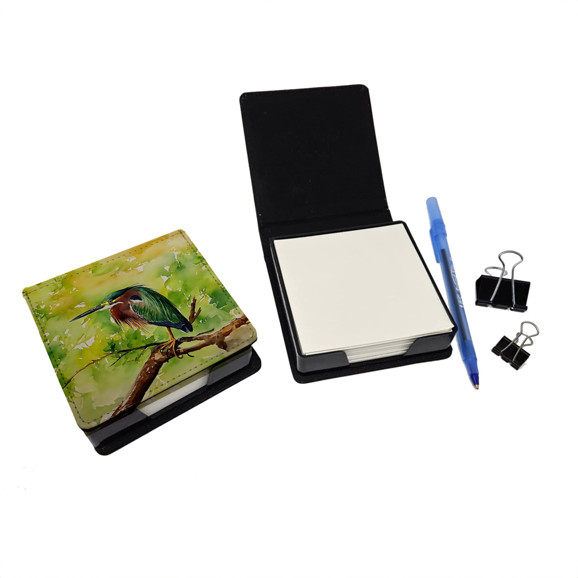 PU Leather Note Paper Holder featuring breed specific Green Heron artwork. Elevate your workspace with this PU Leather Note Paper Holder, crafted to resemble luxurious leather without the use of animal products. Made from durable synthetic PU leather, it offers both a premium look and eco-friendly appeal. This note holder, compactly sized at 4.25 x 4.25 x 1.25 inches, includes about 160 sheets of 3.75 x 3.75-inch note paper—ideal for quick notes and reminders. An exclusive artist-designed cover makes each holder uniquely vibrant, adding a splash of color and personality to any desk or office. The discrete design keeps note paper hidden, maintaining a neat and organized workspace. Perfect as a gift or for personal use, this stylish holder is refillable with standard paper, ensuring long-lasting utility. A must-have for anyone seeking a sophisticated, artful touch to their workspace while supporting animal-friendly products. Add style, organization, and creativity to your everyday routine with this elegant note paper holder.