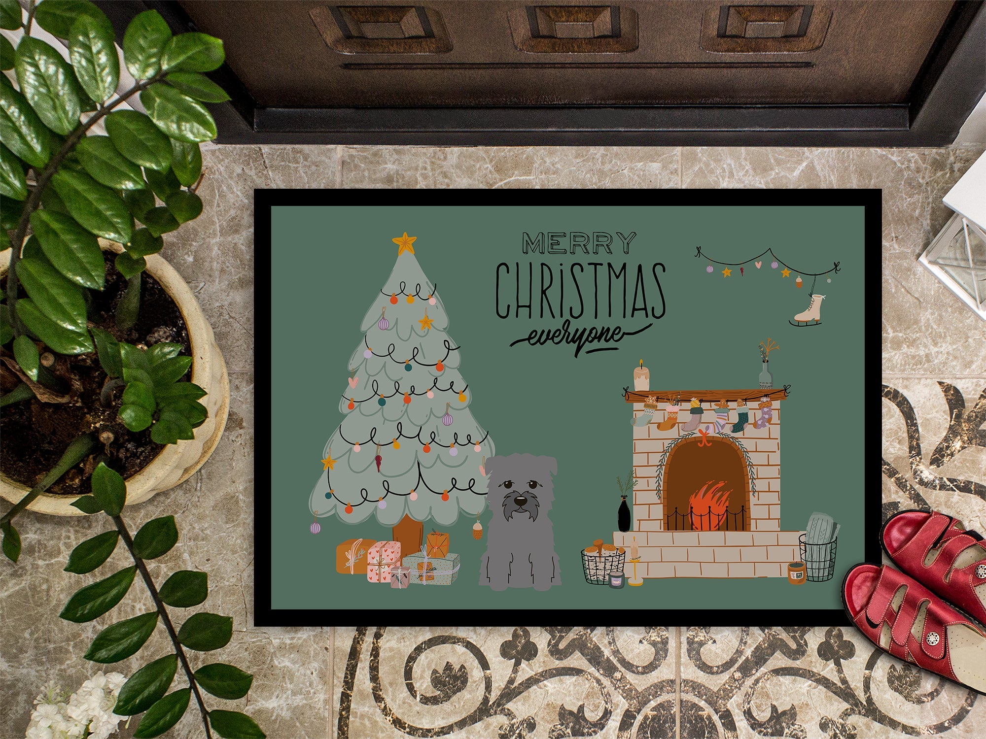 Decorate your space with our Christmas Grey Glen of Imal artwork on a Doormat. Welcome your guests in style with our Artwork Door Mat, designed to withstand almost any weather condition. This mat, measuring approximately 24 by 36 inches, is held together by durable black binding tape. Its top layer, composed of polyester felt, is dyed with the eye-catching image you see on the mat. A few layers below provide the mat with stability, while its rubber bottom is stamped to help prevent slipping and ensures safety. Our mat works wonderfully as both an indoor or outdoor door mat. For cleaning, simply hose it off with water or use a power washer - no need for any cleaner that produces suds. Avoid scrubbing with a brush, instead, opt for the vacuum on floor setting. Designed manufactured and printed in the USA, this mat is a perfect addition to your porch, outdoor kitchen, entryway, or any indoor space. Its unique design makes it a charming decorative rug that greets your guests and adds a stylish touch to your home decor.