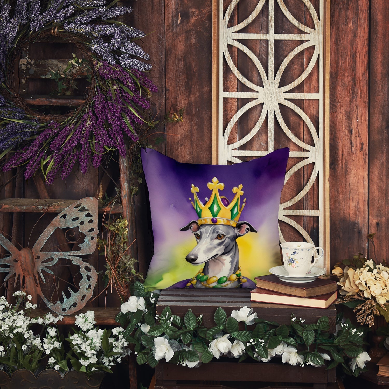 Throw Pillow featuring breed specific Greyhound artwork. Celebrate Mardi Gras with this Mardi Gras Pillow. Add a touch of vibrancy and comfort to your outdoor seating with Caroline's Treasures Fabric Decorative Pillow. Measuring approximately 14 inches by 14 inches, this outdoor pillow is crafted to elevate the appeal of your patio furniture, infusing it with vivid color and artistic flair. The pillow includes a 100% Polyester Fabric sham filled with a quality pillow form to provide superior comfort. Innovatively made from our brand new material, specifically woven for its water resistance, this pillow is designed for durability. The soft canvas fabric offers versatility in use, fit for your indoor couch or your outdoor patio, porch, or veranda. The fabric is dyed with colorfast dyes built for resilience against weather conditions, ensuring the pillow retains its beauty over time. Constructed by sewing three fabric pieces to create a sham, the polyester insert is then nestled inside to form the pillow, resulting in an overstuffed pillow that maintains its shape. Both the sham and the pillow insert are proudly made in the United States. As the pillows are handcrafted, there may be minor variations in size, further enhancing their unique charm. Experience comfort in style with Caroline's Treasures Fabric Decorative Pillow.