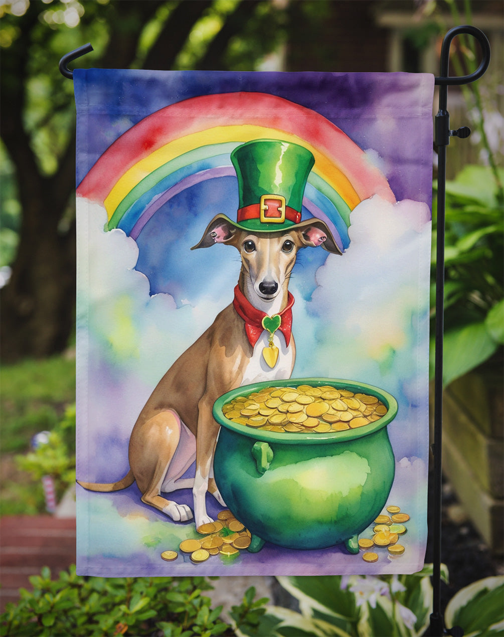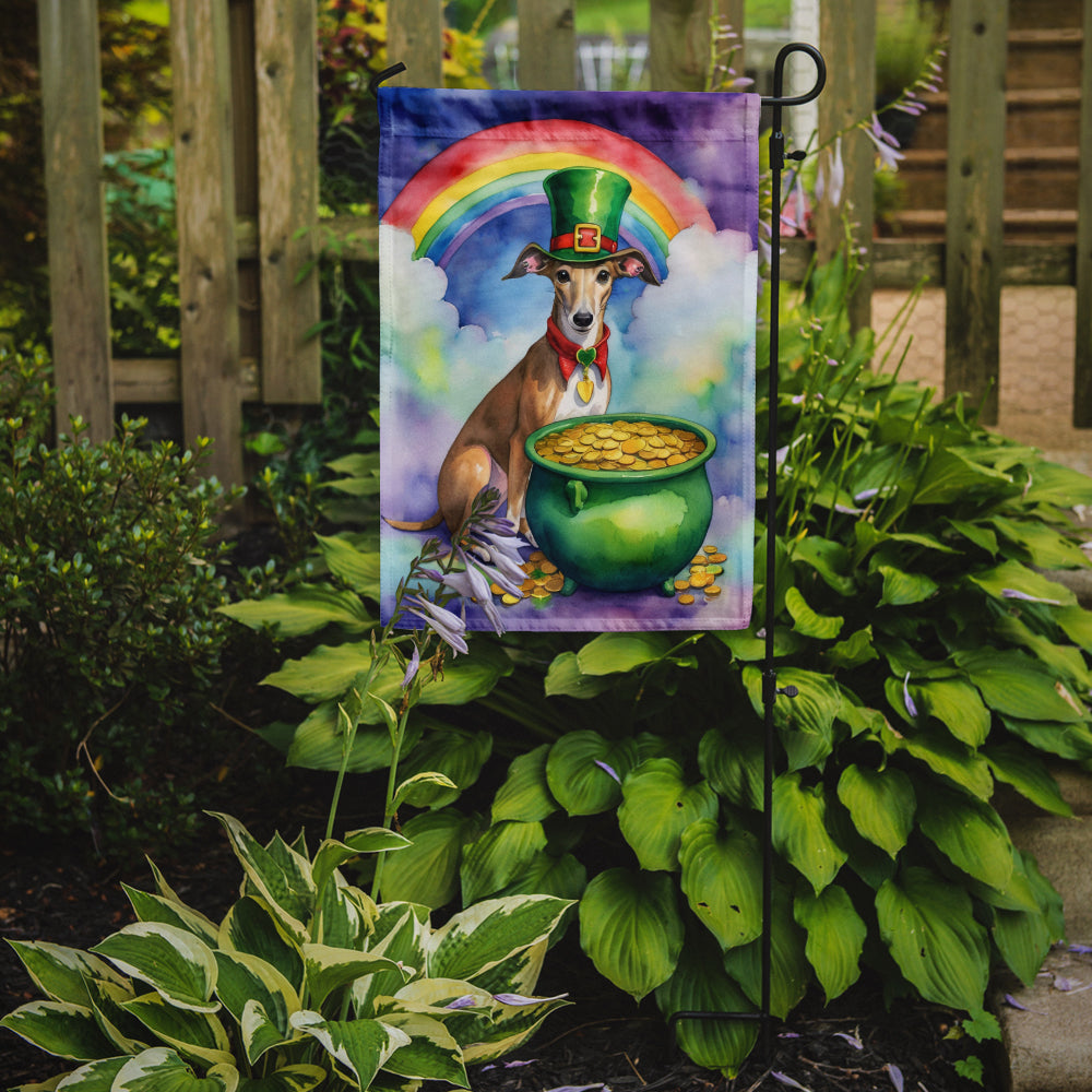 Decorate your space with our St Patrick's Day Greyhound artwork on a Garden Flag. Enhance the beauty of your garden, patio, or yard with Caroline's Treasures Decorative Garden Flag, proudly made in the USA. Crafted from two pieces of thick, double-sided polyester fabric, this 2-ply garden flag is designed to withstand various weather conditions, making it water-resistant and weatherproof. Featuring correctly readable words on both sides, this garden flag offers a delightful visual experience from any angle. With its heavier weight, it stands out among other garden flags, ensuring stability and durability even in wind, rain, and snow. Measuring approximately 11 1/4 inches by 15 1/2 inches, this flag allows you to personalize your outdoor decor. It comes with a 1 1/2-inch sleeve sewn in, allowing easy attachment to any standard garden flag stand or garden size porch hanger (sold separately). Make a statement in your outdoor space with Caroline's Treasures Decorative Garden Flag, a vibrant and high-quality flag that adds color and personality to your surroundings. Proudly made in the USA, it's a symbol of quality craftsmanship and attention to detail.