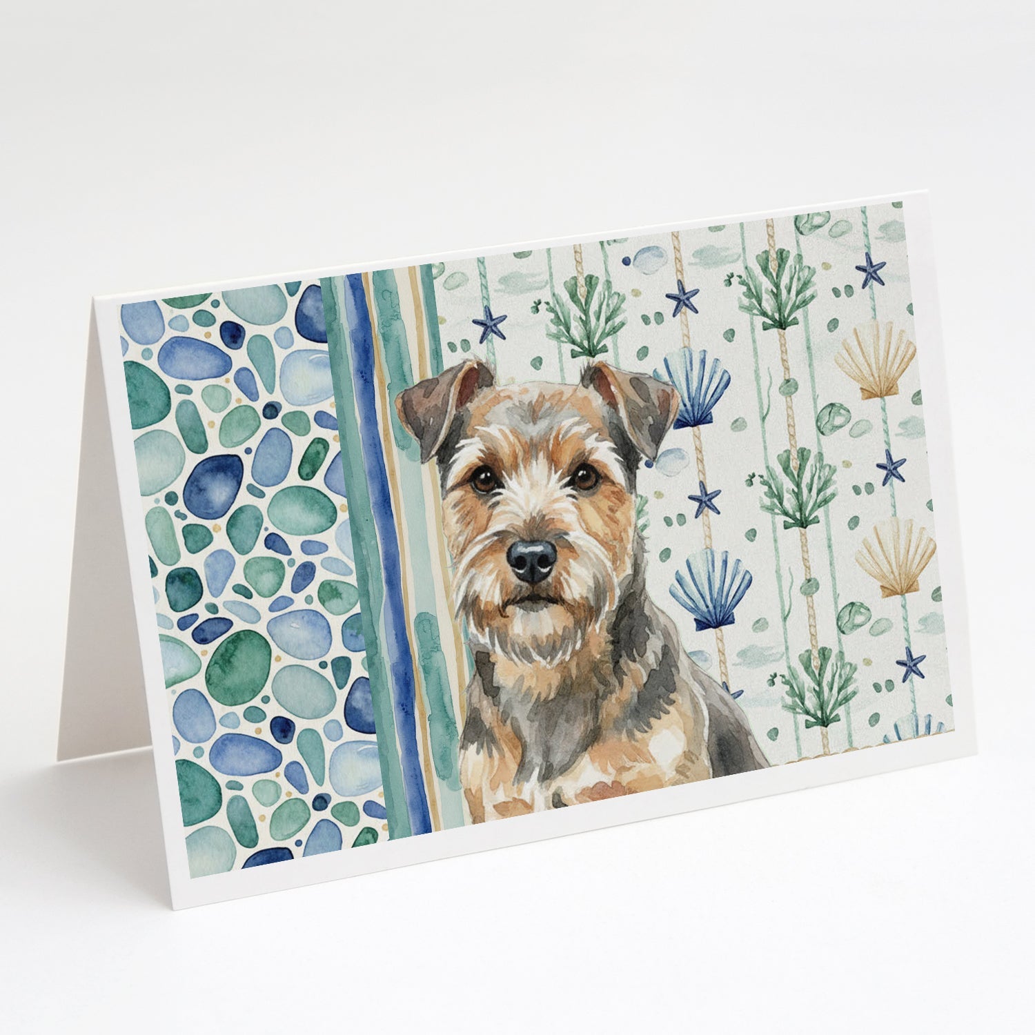 Shown here is the Grizzle and Tan Norfolk Terrier Coastal Sea Glass Greeting Cards Pack of 8 from Caroline's Treasures featuring artwork of a Norfolk Terrier in a Everyday design. The detailed illustration and vibrant colors make it a standout accent that celebrates both seasonal style and love for the subject. This image features a calming coastal watercolor pattern with soft seashells, seaweed, starfish, and pebble-inspired accents arranged in a repeating design. The soothing palette of blues, greens, and sandy neutrals creates a relaxed, beach-inspired look that adds a fresh and tranquil feel to any space. Everyday décor celebrates personal style and the small moments that make a house feel like home. Thoughtful designs add warmth and personality that can be enjoyed year-round. Celebrate special moments with Caroline's Treasures Printed Greeting Card Pack. This pack includes eight beautifully folded 5x7 cards, accompanied by eight matching white envelopes. With blank interiors, these cards provide ample space for your personalized messages and heartfelt holiday greetings. Each card features captivating full-color artwork, meticulously printed in our facility on high-quality 80 lb cover stock or 216 GSM. The super smooth finish of the white cards enhances the visual impact of the artwork, creating a truly stunning presentation. Designed by our talented in-house artists or licensed artists, the artwork on these cards showcases their creativity and attention to detail. From vibrant illustrations to captivating designs, each card tells its own unique story. Whether it's for birthdays, anniversaries, holidays, or any special occasion, Caroline's Treasures Greeting Card Pack is the perfect way to convey your heartfelt sentiments. Share joy, love, and warm wishes with these exquisite cards and make every moment unforgettable. Perfect for: Writing personal messages, everyday correspondence, and thoughtful notes, Dogs-themed stationery collections, or year-round use for Norfolk Terrier lovers. Norfolk Terriers are small, energetic dogs known for their friendly personality and alert nature. This terrier breed is admired for its adaptability, intelligence, and affectionate loyalty. Makes a heartfelt gift for: Norfolk Terrier owners, Dogs lovers, Everyday gifts, pet parents, friends who adore their Norfolk Terrier, or anyone celebrating Dogs.