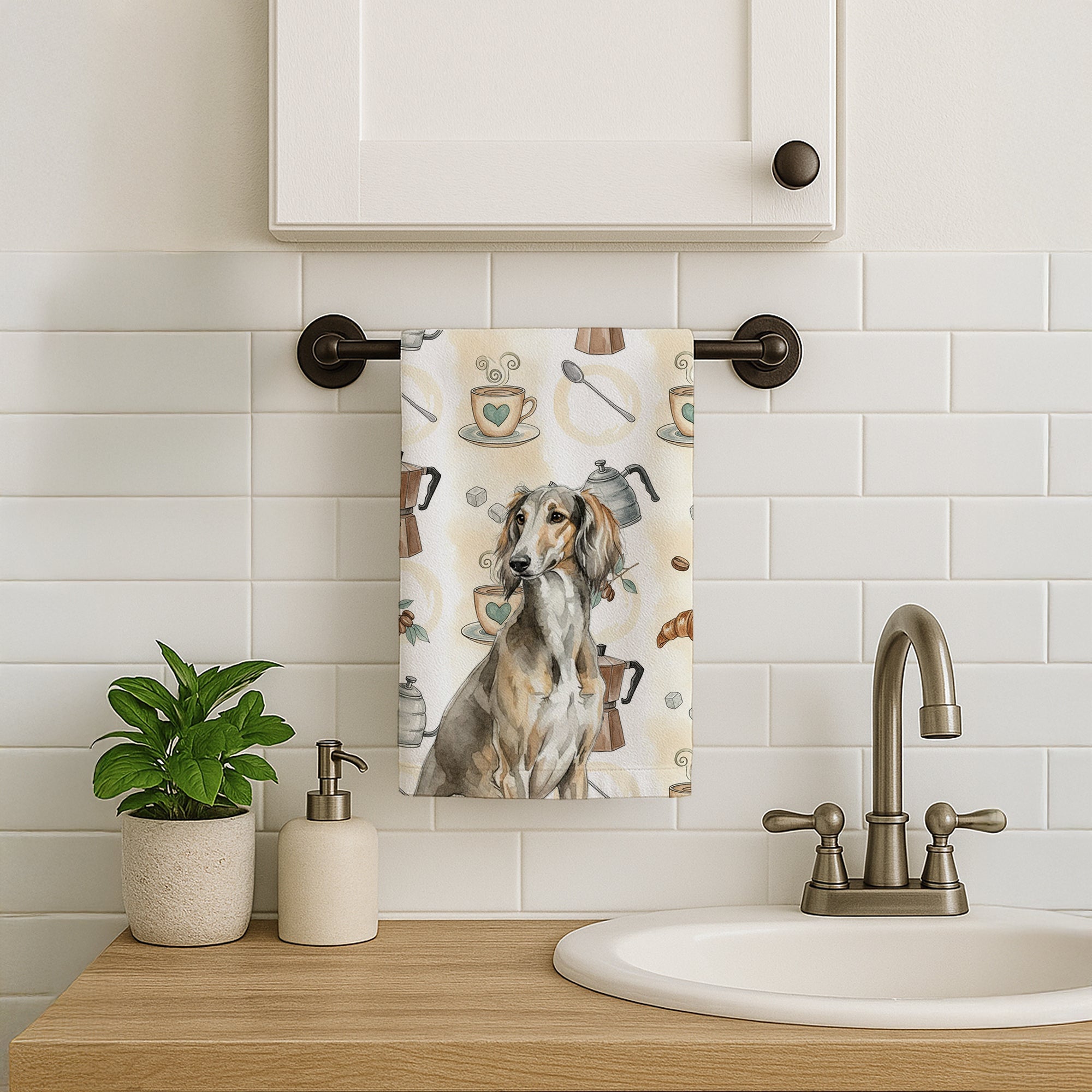 Kitchen Towel featuring breed specific Saluki artwork. Start your morning with charm and function thanks to our Coffee Time Kitchen Towel Collection. Featuring playful watercolor artwork of coffee pots, cups, croissants, and a dog portrait, these towels bring warmth and personality to your kitchen or bath. Crafted with a plush minky polyester front that polishes glassware to a shine, and a 100% cotton terry loop back for absorbency, they combine durability with practicality. Artwork is permanently dyed into the fibers to keep colors fresh wash after wash. Measuring 15" x 25", these machine-washable towels are finished with bound edges to hold their shape. Designed and printed in the USA, they’re perfect for kitchens, coffee bars, guest baths, or as thoughtful gifts for dog lovers and coffee enthusiasts alike.