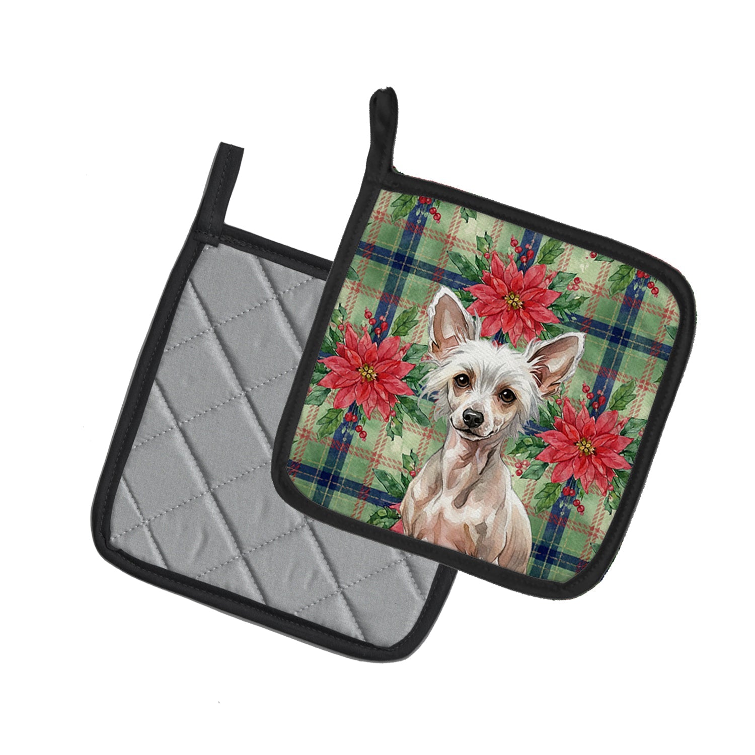 Pair of Pot Holders featuring breed specific Chinese Crested artwork. Celebrate Christmas with this Christmas Pair of Pot Holders. Add warmth, personality, and function to your kitchen with our Christmas Poinsettas Pot Holder Pair. Each set includes two quilted hot pads, featuring original full-color watercolor artwork on a soft polyester front accented by black trim. Crafted with multiple layers for performance: Top Layer: Vibrant artwork permanently dyed into polyester fabric. Middle Layer: US-manufactured insulated material with breathable polyester fibers and a reflective metalized film that reflects heat back to its source. Bottom Layer: A silver heat-resistant backing for extra protection. Each pot holder measures 7.5" x 7.5", includes a hanging tab, and is quilted for durability. Use them to protect your hands, countertops, and tabletops — or as decorative trivets for Thanksgiving, Christmas, or everyday meals.