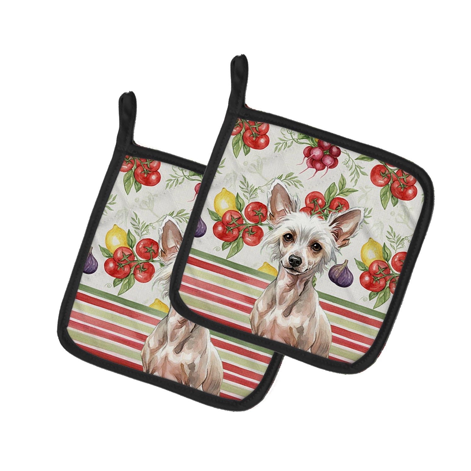 Pair of Pot Holders featuring breed specific Chinese Crested artwork. Add warmth, personality, and function to your kitchen with our Vegetables Pot Holder Pair. Each set includes two quilted hot pads, featuring original full-color watercolor artwork on a soft polyester front accented by black trim. Crafted with multiple layers for performance: Top Layer: Vibrant artwork permanently dyed into polyester fabric. Middle Layer: US-manufactured insulated material with breathable polyester fibers and a reflective metalized film that reflects heat back to its source. Bottom Layer: A silver heat-resistant backing for extra protection. Each pot holder measures 7.5" x 7.5", includes a hanging tab, and is quilted for durability. Use them to protect your hands, countertops, and tabletops — or as decorative trivets for Thanksgiving, Christmas, or everyday meals.