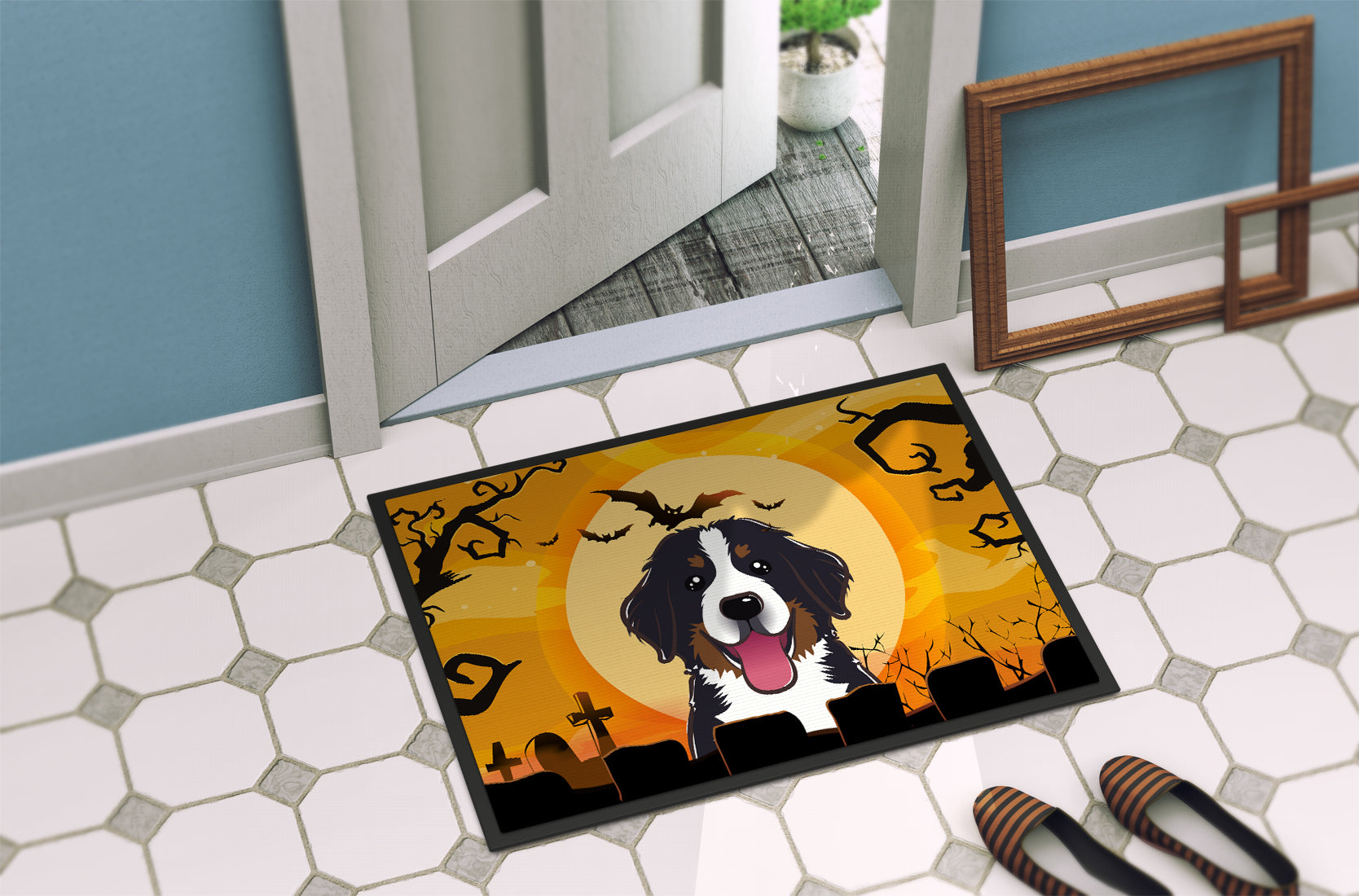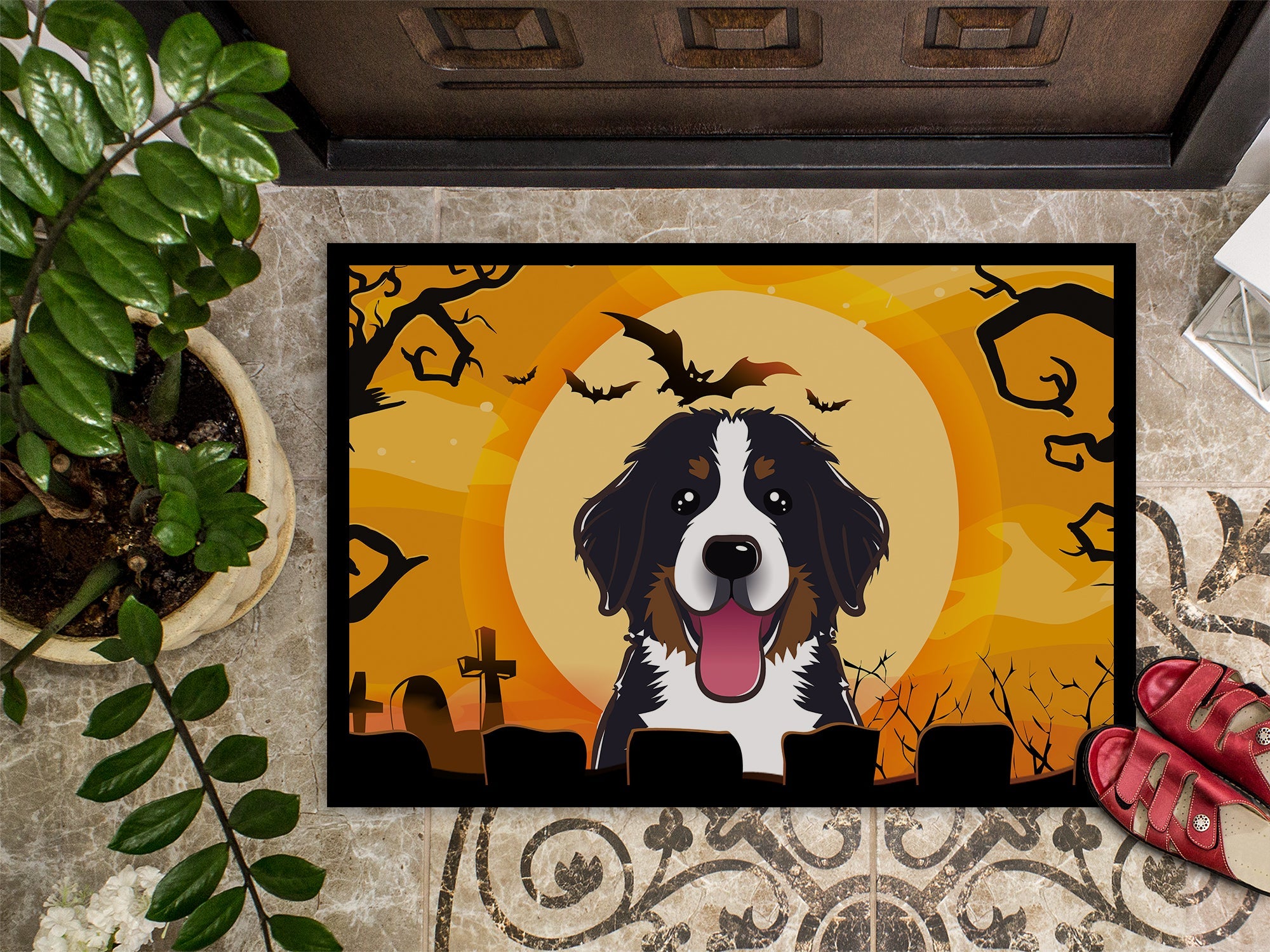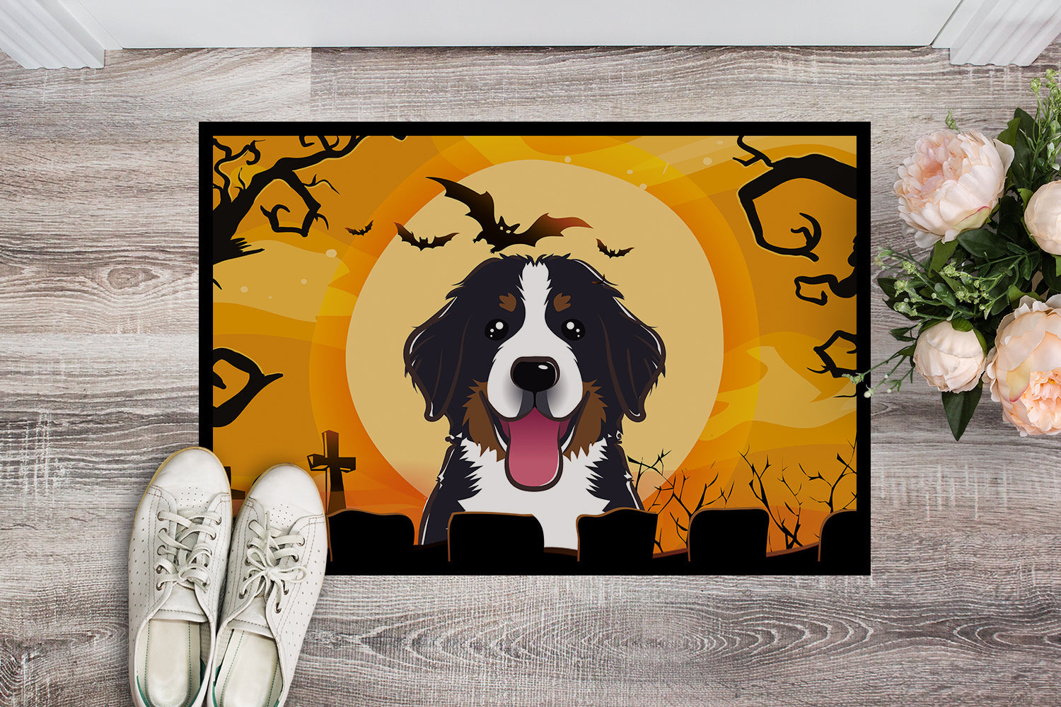 Decorate your space with our Halloween Bernese Mountain Dog artwork on a Doormat. Welcome your guests in style with our Artwork Door Mat, designed to withstand almost any weather condition. This mat, measuring approximately 24 by 36 inches, is held together by durable black binding tape. Its top layer, composed of polyester felt, is dyed with the eye-catching image you see on the mat. A few layers below provide the mat with stability, while its rubber bottom is stamped to help prevent slipping and ensures safety. Our mat works wonderfully as both an indoor or outdoor door mat. For cleaning, simply hose it off with water or use a power washer - no need for any cleaner that produces suds. Avoid scrubbing with a brush, instead, opt for the vacuum on floor setting. Designed manufactured and printed in the USA, this mat is a perfect addition to your porch, outdoor kitchen, entryway, or any indoor space. Its unique design makes it a charming decorative rug that greets your guests and adds a stylish touch to your home decor.
