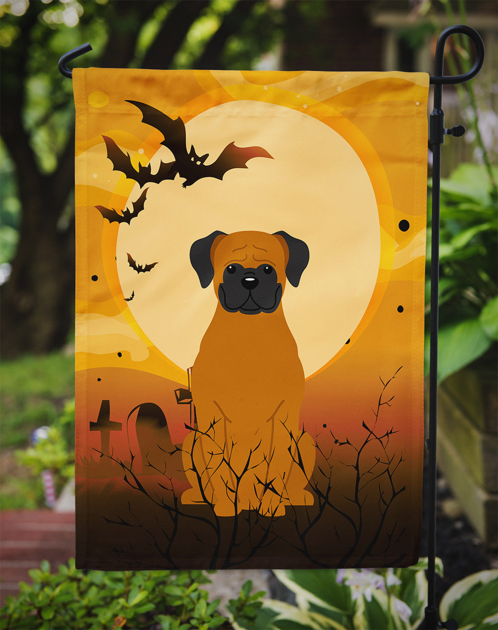Decorate your space with our Halloween Boxer artwork on a Garden Flag. Enhance the beauty of your garden, patio, or yard with Caroline's Treasures Decorative Garden Flag, proudly made in the USA. Crafted from two pieces of thick, double-sided polyester fabric, this 2-ply garden flag is designed to withstand various weather conditions, making it water-resistant and weatherproof. Featuring correctly readable words on both sides, this garden flag offers a delightful visual experience from any angle. With its heavier weight, it stands out among other garden flags, ensuring stability and durability even in wind, rain, and snow. Measuring approximately 11 1/4 inches by 15 1/2 inches, this flag allows you to personalize your outdoor decor. It comes with a 1 1/2-inch sleeve sewn in, allowing easy attachment to any standard garden flag stand or garden size porch hanger (sold separately). Make a statement in your outdoor space with Caroline's Treasures Decorative Garden Flag, a vibrant and high-quality flag that adds color and personality to your surroundings. Proudly made in the USA, it's a symbol of quality craftsmanship and attention to detail.