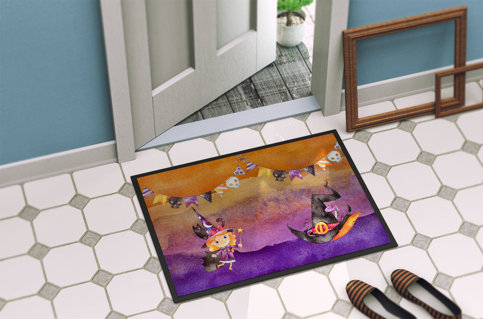 Decorate your space with our Halloween artwork on a Doormat. Welcome your guests in style with our Artwork Door Mat, designed to withstand almost any weather condition. This mat, measuring approximately 24 by 36 inches, is held together by durable black binding tape. Its top layer, composed of polyester felt, is dyed with the eye-catching image you see on the mat. A few layers below provide the mat with stability, while its rubber bottom is stamped to help prevent slipping and ensures safety. Our mat works wonderfully as both an indoor or outdoor door mat. For cleaning, simply hose it off with water or use a power washer - no need for any cleaner that produces suds. Avoid scrubbing with a brush, instead, opt for the vacuum on floor setting. Designed manufactured and printed in the USA, this mat is a perfect addition to your porch, outdoor kitchen, entryway, or any indoor space. Its unique design makes it a charming decorative rug that greets your guests and adds a stylish touch to your home decor.