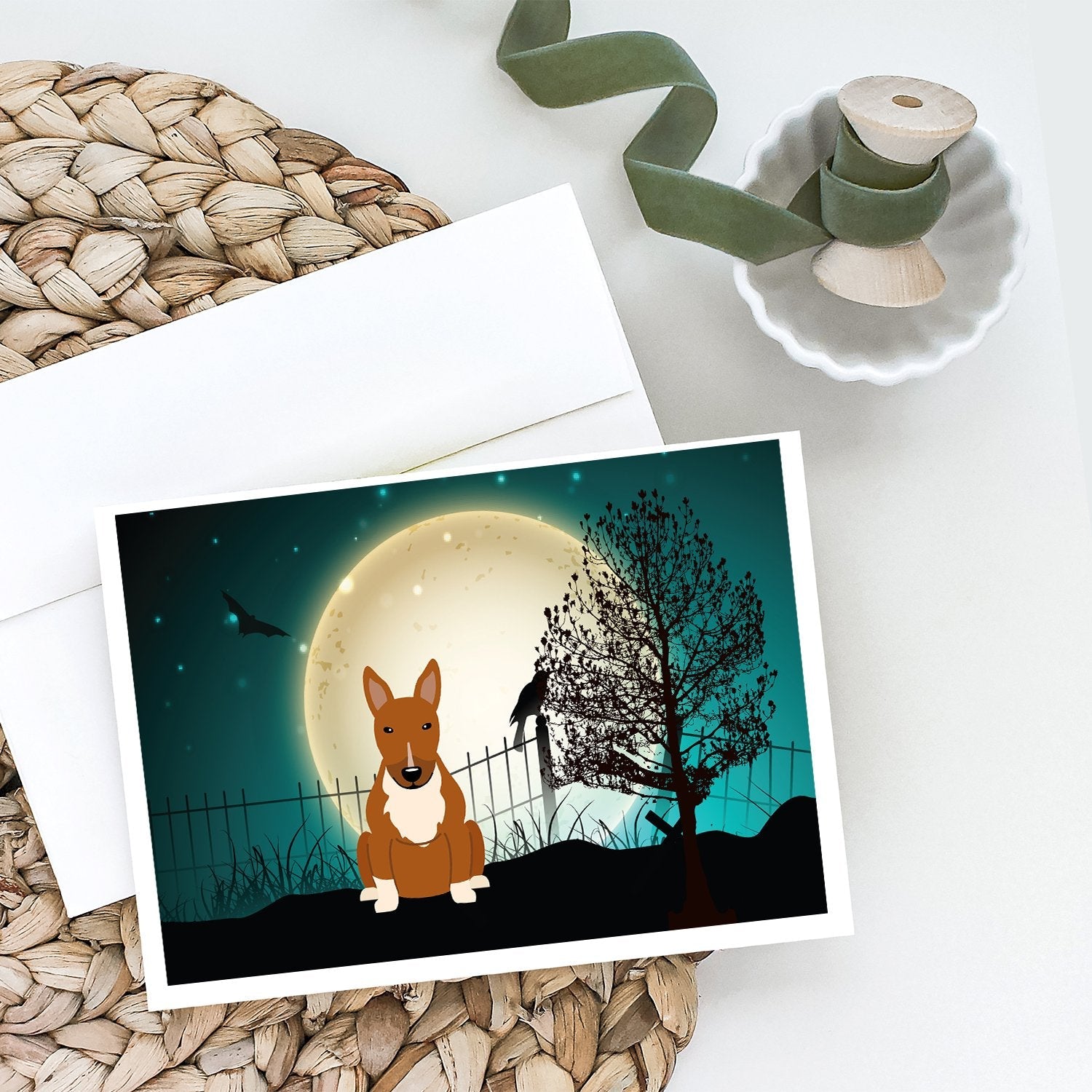 Decorate your space with our Halloween Bull Terrier artwork on a . Celebrate special moments with Caroline's Treasures Printed Greeting Card Pack. This pack includes eight beautifully folded 5x7 cards, accompanied by eight matching white envelopes. With blank interiors, these cards provide ample space for your personalized messages and heartfelt holiday greetings. Each card features captivating full-color artwork, meticulously printed in our facility on high-quality 80 lb cover stock or 216 GSM. The super smooth finish of the white cards enhances the visual impact of the artwork, creating a truly stunning presentation. Designed by our talented in-house artists or licensed artists, the artwork on these cards showcases their creativity and attention to detail. From vibrant illustrations to captivating designs, each card tells its own unique story. Whether it's for birthdays, anniversaries, holidays, or any special occasion, Caroline's Treasures Greeting Card Pack is the perfect way to convey your heartfelt sentiments. Share joy, love, and warm wishes with these exquisite cards and make every moment unforgettable.