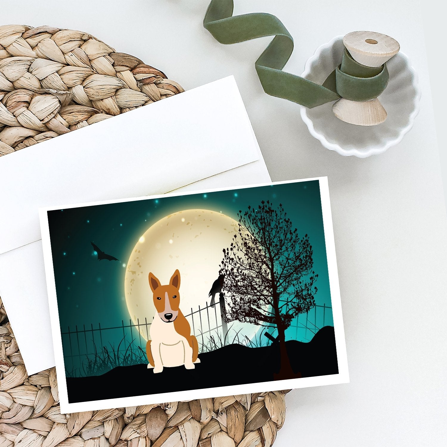Decorate your space with our Halloween Bull Terrier artwork on a . Celebrate special moments with Caroline's Treasures Printed Greeting Card Pack. This pack includes eight beautifully folded 5x7 cards, accompanied by eight matching white envelopes. With blank interiors, these cards provide ample space for your personalized messages and heartfelt holiday greetings. Each card features captivating full-color artwork, meticulously printed in our facility on high-quality 80 lb cover stock or 216 GSM. The super smooth finish of the white cards enhances the visual impact of the artwork, creating a truly stunning presentation. Designed by our talented in-house artists or licensed artists, the artwork on these cards showcases their creativity and attention to detail. From vibrant illustrations to captivating designs, each card tells its own unique story. Whether it's for birthdays, anniversaries, holidays, or any special occasion, Caroline's Treasures Greeting Card Pack is the perfect way to convey your heartfelt sentiments. Share joy, love, and warm wishes with these exquisite cards and make every moment unforgettable.