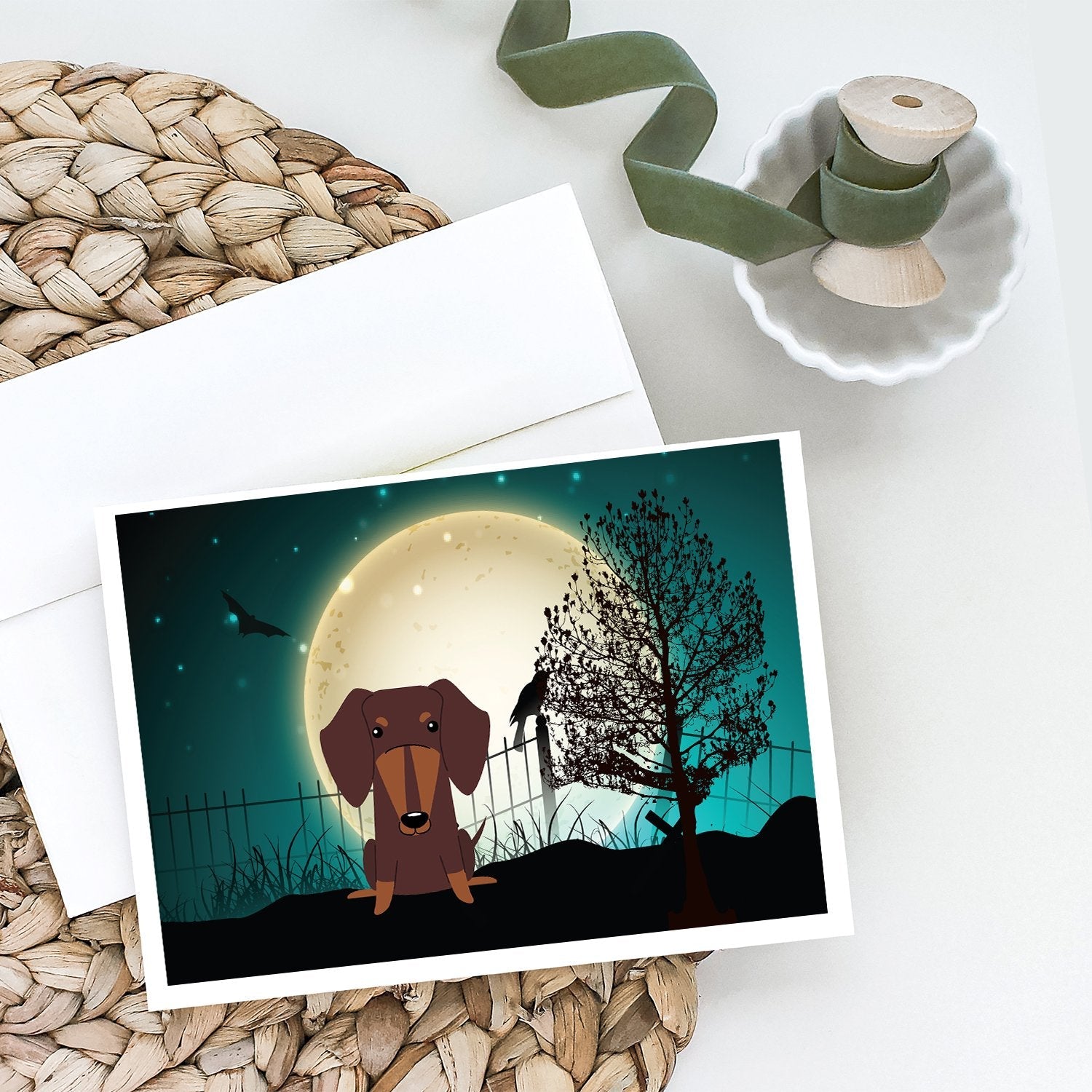 Decorate your space with our Halloween Dachshund artwork on a . Celebrate special moments with Caroline's Treasures Printed Greeting Card Pack. This pack includes eight beautifully folded 5x7 cards, accompanied by eight matching white envelopes. With blank interiors, these cards provide ample space for your personalized messages and heartfelt holiday greetings. Each card features captivating full-color artwork, meticulously printed in our facility on high-quality 80 lb cover stock or 216 GSM. The super smooth finish of the white cards enhances the visual impact of the artwork, creating a truly stunning presentation. Designed by our talented in-house artists or licensed artists, the artwork on these cards showcases their creativity and attention to detail. From vibrant illustrations to captivating designs, each card tells its own unique story. Whether it's for birthdays, anniversaries, holidays, or any special occasion, Caroline's Treasures Greeting Card Pack is the perfect way to convey your heartfelt sentiments. Share joy, love, and warm wishes with these exquisite cards and make every moment unforgettable.