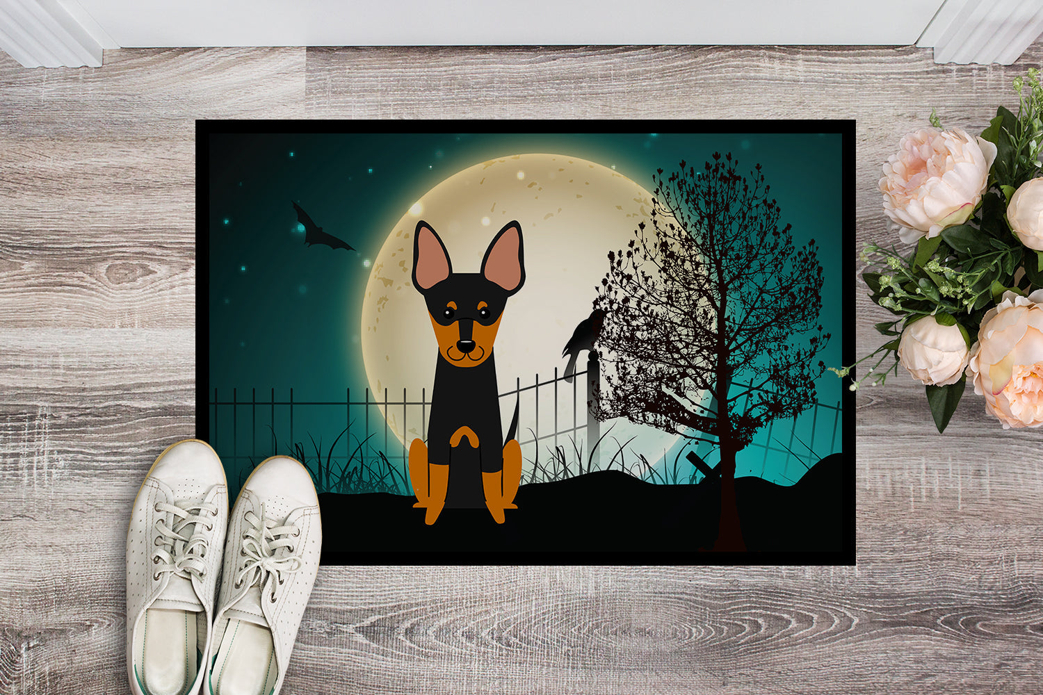 Decorate your space with our Halloween English Toy Terrier artwork on a Doormat. Welcome your guests in style with our Artwork Door Mat, designed to withstand almost any weather condition. This mat, measuring approximately 24 by 36 inches, is held together by durable black binding tape. Its top layer, composed of polyester felt, is dyed with the eye-catching image you see on the mat. A few layers below provide the mat with stability, while its rubber bottom is stamped to help prevent slipping and ensures safety. Our mat works wonderfully as both an indoor or outdoor door mat. For cleaning, simply hose it off with water or use a power washer - no need for any cleaner that produces suds. Avoid scrubbing with a brush, instead, opt for the vacuum on floor setting. Designed manufactured and printed in the USA, this mat is a perfect addition to your porch, outdoor kitchen, entryway, or any indoor space. Its unique design makes it a charming decorative rug that greets your guests and adds a stylish touch to your home decor.
