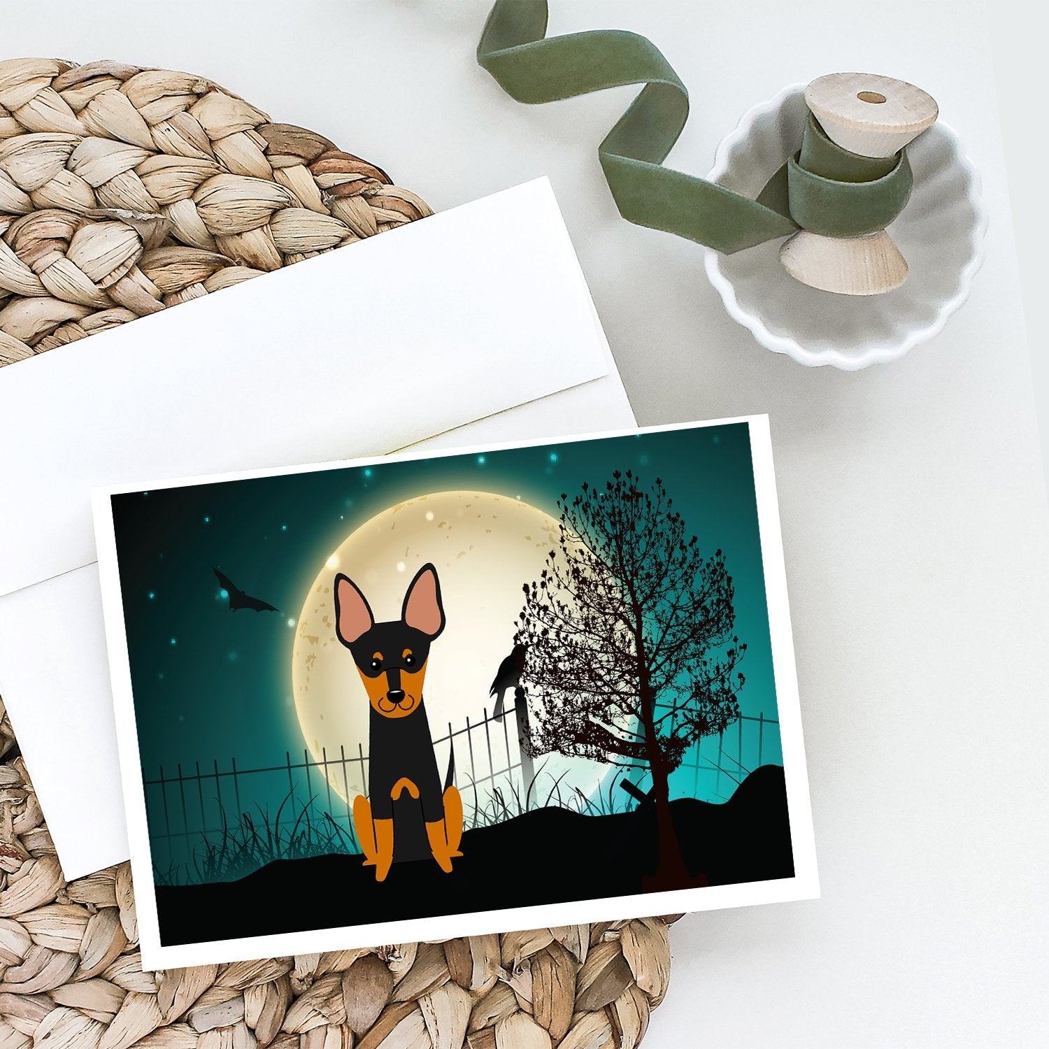 Decorate your space with our Halloween English Toy Terrier artwork on a . Celebrate special moments with Caroline's Treasures Printed Greeting Card Pack. This pack includes eight beautifully folded 5x7 cards, accompanied by eight matching white envelopes. With blank interiors, these cards provide ample space for your personalized messages and heartfelt holiday greetings. Each card features captivating full-color artwork, meticulously printed in our facility on high-quality 80 lb cover stock or 216 GSM. The super smooth finish of the white cards enhances the visual impact of the artwork, creating a truly stunning presentation. Designed by our talented in-house artists or licensed artists, the artwork on these cards showcases their creativity and attention to detail. From vibrant illustrations to captivating designs, each card tells its own unique story. Whether it's for birthdays, anniversaries, holidays, or any special occasion, Caroline's Treasures Greeting Card Pack is the perfect way to convey your heartfelt sentiments. Share joy, love, and warm wishes with these exquisite cards and make every moment unforgettable.