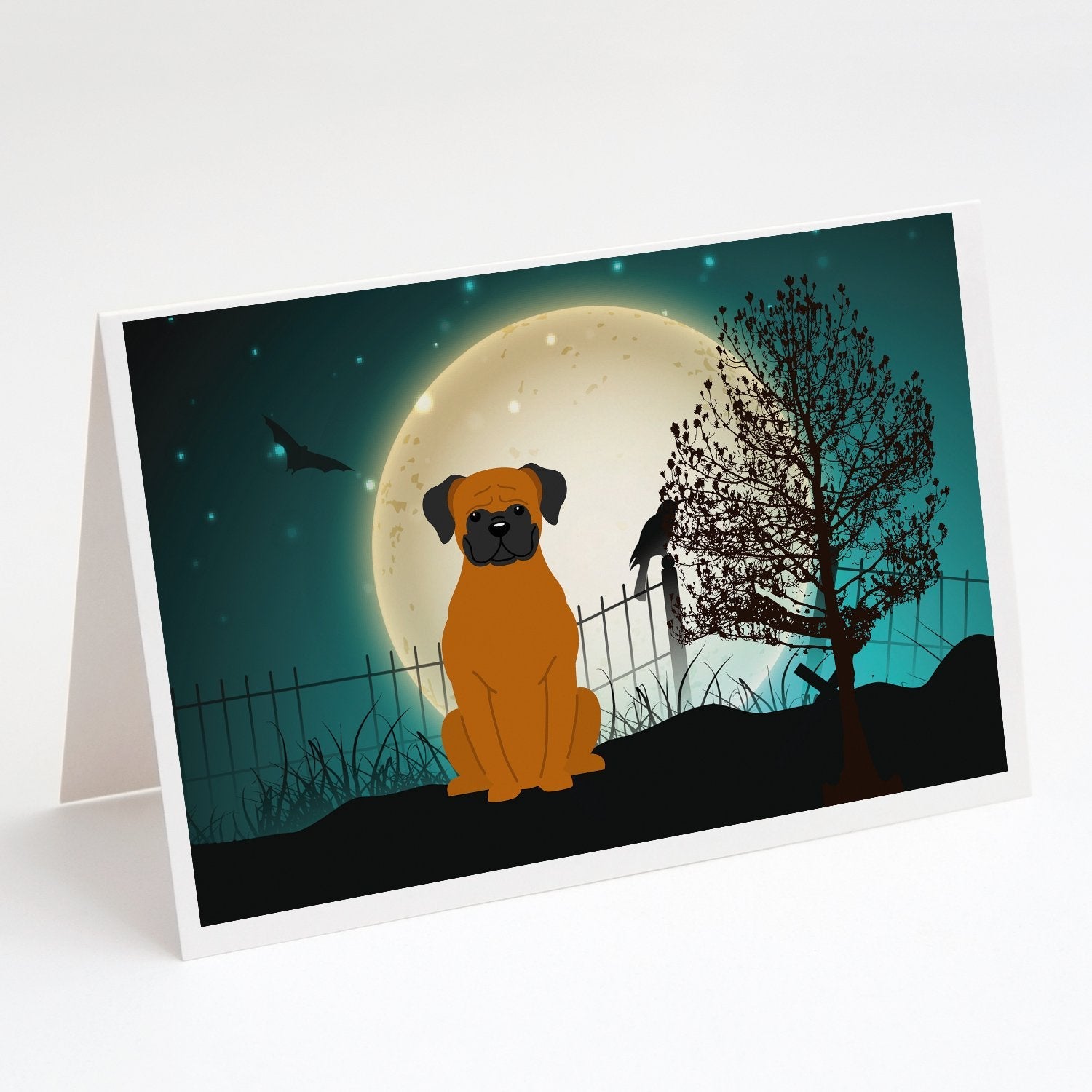 Decorate your space with our Halloween Boxer artwork on a . Celebrate special moments with Caroline's Treasures Printed Greeting Card Pack. This pack includes eight beautifully folded 5x7 cards, accompanied by eight matching white envelopes. With blank interiors, these cards provide ample space for your personalized messages and heartfelt holiday greetings. Each card features captivating full-color artwork, meticulously printed in our facility on high-quality 80 lb cover stock or 216 GSM. The super smooth finish of the white cards enhances the visual impact of the artwork, creating a truly stunning presentation. Designed by our talented in-house artists or licensed artists, the artwork on these cards showcases their creativity and attention to detail. From vibrant illustrations to captivating designs, each card tells its own unique story. Whether it's for birthdays, anniversaries, holidays, or any special occasion, Caroline's Treasures Greeting Card Pack is the perfect way to convey your heartfelt sentiments. Share joy, love, and warm wishes with these exquisite cards and make every moment unforgettable.