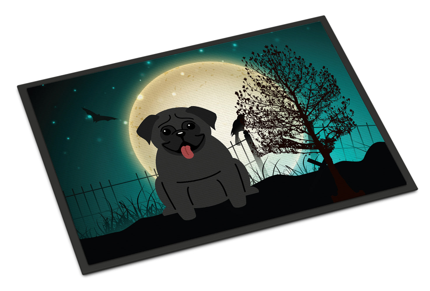 Decorate your space with our Halloween Pug artwork on a Doormat. Welcome your guests in style with our Artwork Door Mat, designed to withstand almost any weather condition. This mat, measuring approximately 24 by 36 inches, is held together by durable black binding tape. Its top layer, composed of polyester felt, is dyed with the eye-catching image you see on the mat. A few layers below provide the mat with stability, while its rubber bottom is stamped to help prevent slipping and ensures safety. Our mat works wonderfully as both an indoor or outdoor door mat. For cleaning, simply hose it off with water or use a power washer - no need for any cleaner that produces suds. Avoid scrubbing with a brush, instead, opt for the vacuum on floor setting. Designed manufactured and printed in the USA, this mat is a perfect addition to your porch, outdoor kitchen, entryway, or any indoor space. Its unique design makes it a charming decorative rug that greets your guests and adds a stylish touch to your home decor.