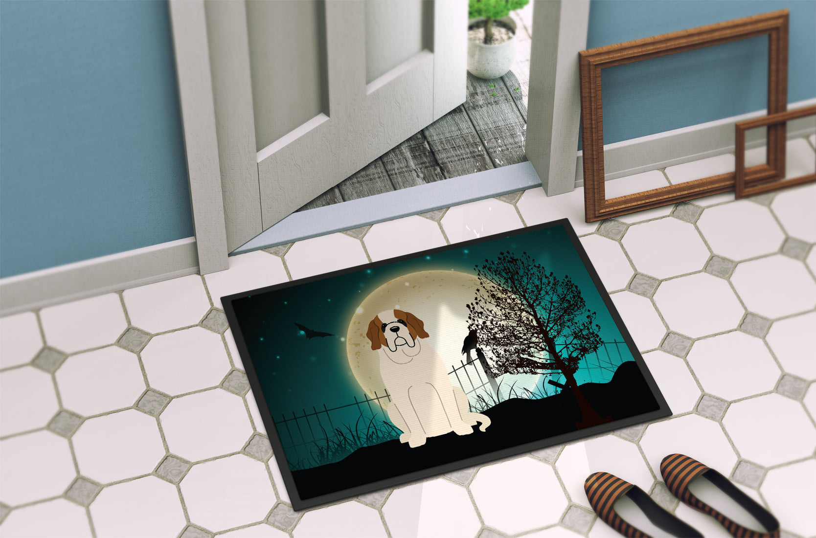Decorate your space with our Halloween Saint Bernard artwork on a Doormat. Welcome your guests in style with our Artwork Door Mat, designed to withstand almost any weather condition. This mat, measuring approximately 24 by 36 inches, is held together by durable black binding tape. Its top layer, composed of polyester felt, is dyed with the eye-catching image you see on the mat. A few layers below provide the mat with stability, while its rubber bottom is stamped to help prevent slipping and ensures safety. Our mat works wonderfully as both an indoor or outdoor door mat. For cleaning, simply hose it off with water or use a power washer - no need for any cleaner that produces suds. Avoid scrubbing with a brush, instead, opt for the vacuum on floor setting. Designed manufactured and printed in the USA, this mat is a perfect addition to your porch, outdoor kitchen, entryway, or any indoor space. Its unique design makes it a charming decorative rug that greets your guests and adds a stylish touch to your home decor.