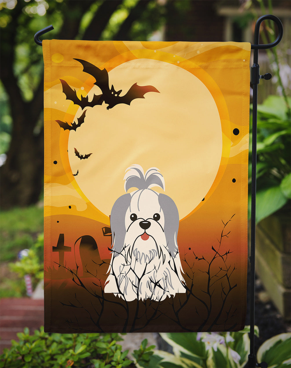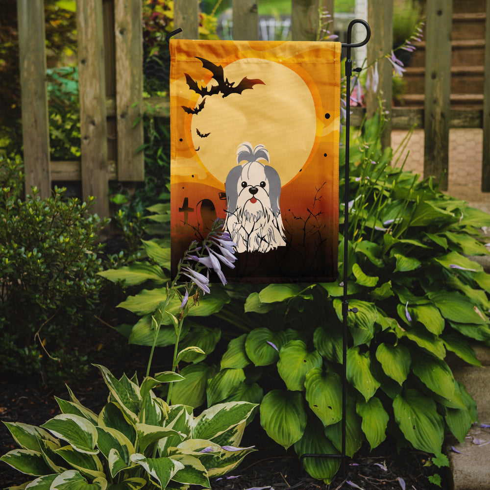 Decorate your space with our Halloween Shih Tzu artwork on a Garden Flag. Enhance the beauty of your garden, patio, or yard with Caroline's Treasures Decorative Garden Flag, proudly made in the USA. Crafted from two pieces of thick, double-sided polyester fabric, this 2-ply garden flag is designed to withstand various weather conditions, making it water-resistant and weatherproof. Featuring correctly readable words on both sides, this garden flag offers a delightful visual experience from any angle. With its heavier weight, it stands out among other garden flags, ensuring stability and durability even in wind, rain, and snow. Measuring approximately 11 1/4 inches by 15 1/2 inches, this flag allows you to personalize your outdoor decor. It comes with a 1 1/2-inch sleeve sewn in, allowing easy attachment to any standard garden flag stand or garden size porch hanger (sold separately). Make a statement in your outdoor space with Caroline's Treasures Decorative Garden Flag, a vibrant and high-quality flag that adds color and personality to your surroundings. Proudly made in the USA, it's a symbol of quality craftsmanship and attention to detail.