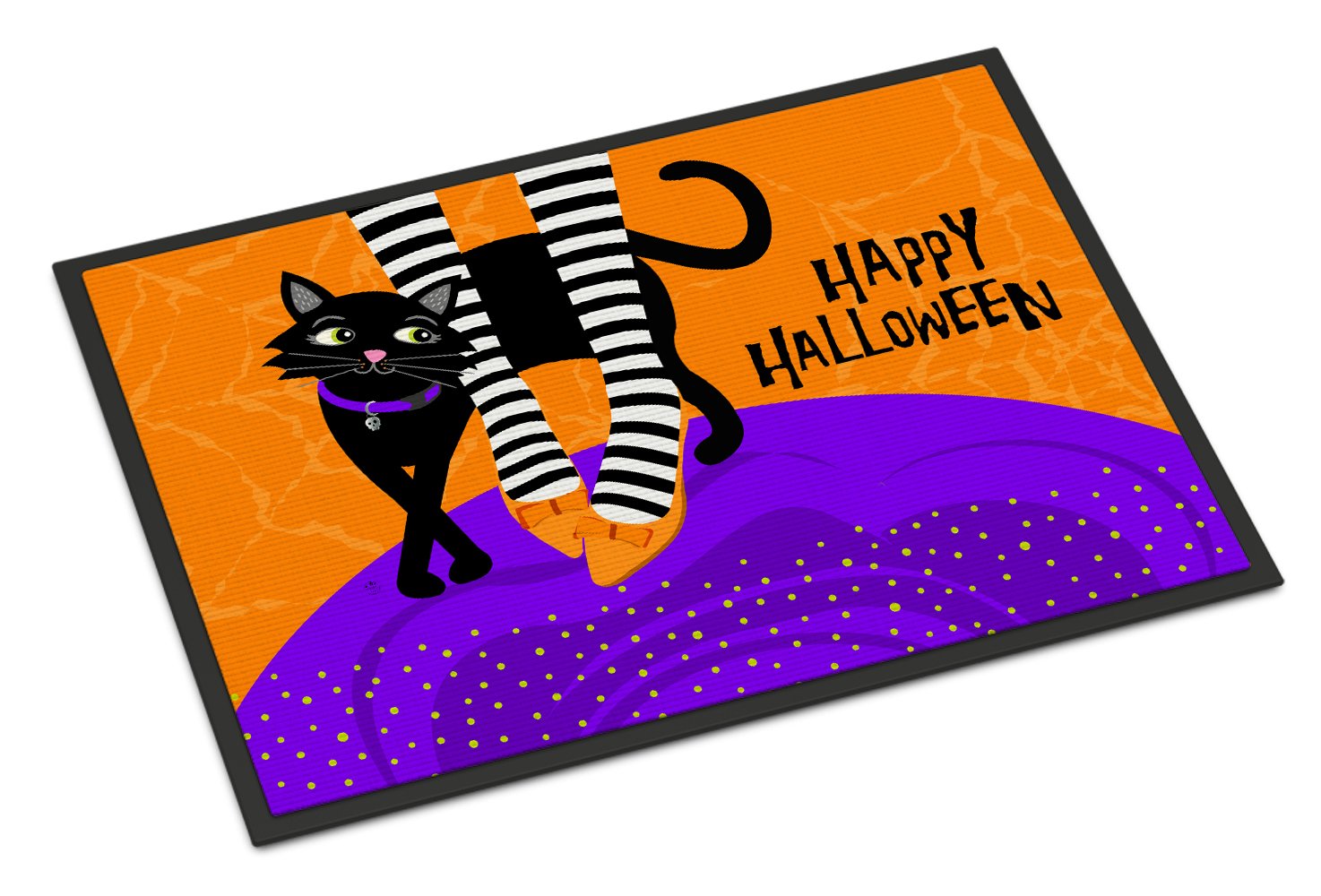 Decorate your space with our Halloween artwork on a Doormat. Welcome your guests in style with our Artwork Door Mat, designed to withstand almost any weather condition. This mat, measuring approximately 24 by 36 inches, is held together by durable black binding tape. Its top layer, composed of polyester felt, is dyed with the eye-catching image you see on the mat. A few layers below provide the mat with stability, while its rubber bottom is stamped to help prevent slipping and ensures safety. Our mat works wonderfully as both an indoor or outdoor door mat. For cleaning, simply hose it off with water or use a power washer - no need for any cleaner that produces suds. Avoid scrubbing with a brush, instead, opt for the vacuum on floor setting. Designed manufactured and printed in the USA, this mat is a perfect addition to your porch, outdoor kitchen, entryway, or any indoor space. Its unique design makes it a charming decorative rug that greets your guests and adds a stylish touch to your home decor.
