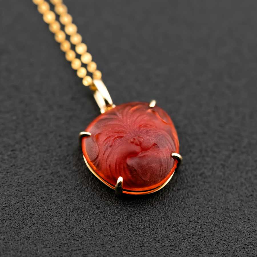 Hand Carved Bichon Dog Mexican Fire Opal Pendant Necklace 18K Yellow Gold.