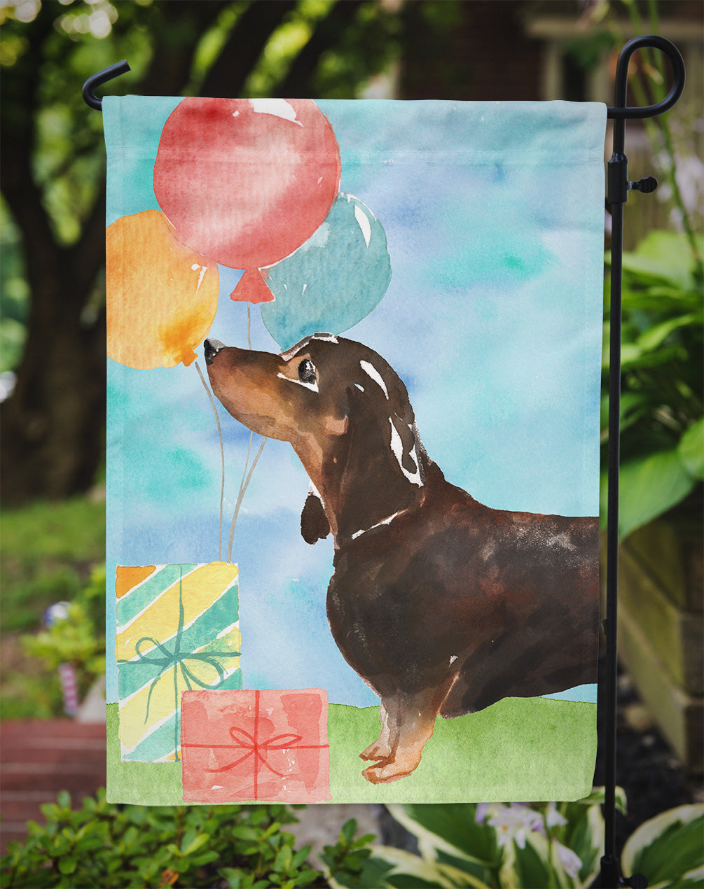 Decorate your space with our Birthday Dachshund artwork on a Garden Flag. Enhance the beauty of your garden, patio, or yard with Caroline's Treasures Decorative Garden Flag, proudly made in the USA. Crafted from two pieces of thick, double-sided polyester fabric, this 2-ply garden flag is designed to withstand various weather conditions, making it water-resistant and weatherproof. Featuring correctly readable words on both sides, this garden flag offers a delightful visual experience from any angle. With its heavier weight, it stands out among other garden flags, ensuring stability and durability even in wind, rain, and snow. Measuring approximately 11 1/4 inches by 15 1/2 inches, this flag allows you to personalize your outdoor decor. It comes with a 1 1/2-inch sleeve sewn in, allowing easy attachment to any standard garden flag stand or garden size porch hanger (sold separately). Make a statement in your outdoor space with Caroline's Treasures Decorative Garden Flag, a vibrant and high-quality flag that adds color and personality to your surroundings. Proudly made in the USA, it's a symbol of quality craftsmanship and attention to detail.