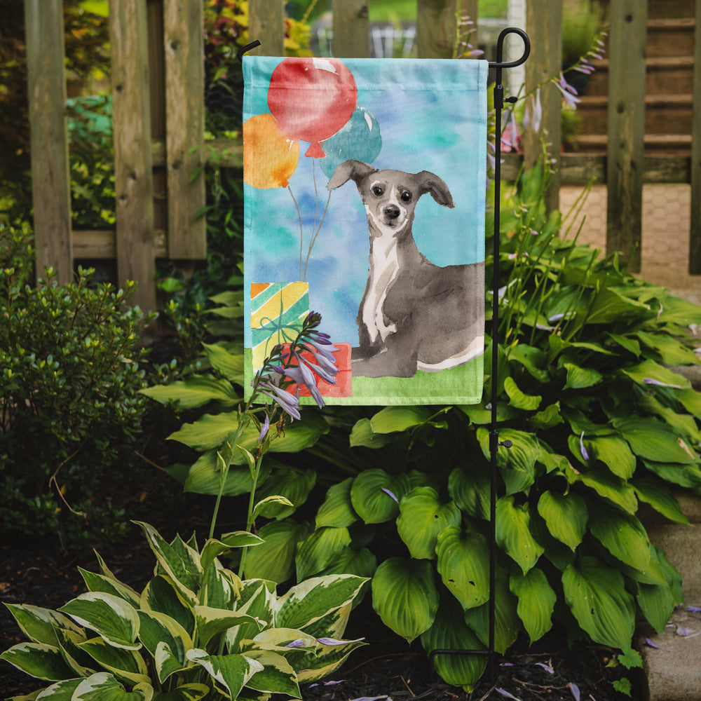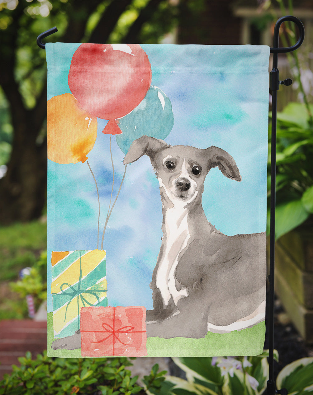 Decorate your space with our Birthday Italian Greyhound artwork on a Garden Flag. Enhance the beauty of your garden, patio, or yard with Caroline's Treasures Decorative Garden Flag, proudly made in the USA. Crafted from two pieces of thick, double-sided polyester fabric, this 2-ply garden flag is designed to withstand various weather conditions, making it water-resistant and weatherproof. Featuring correctly readable words on both sides, this garden flag offers a delightful visual experience from any angle. With its heavier weight, it stands out among other garden flags, ensuring stability and durability even in wind, rain, and snow. Measuring approximately 11 1/4 inches by 15 1/2 inches, this flag allows you to personalize your outdoor decor. It comes with a 1 1/2-inch sleeve sewn in, allowing easy attachment to any standard garden flag stand or garden size porch hanger (sold separately). Make a statement in your outdoor space with Caroline's Treasures Decorative Garden Flag, a vibrant and high-quality flag that adds color and personality to your surroundings. Proudly made in the USA, it's a symbol of quality craftsmanship and attention to detail.