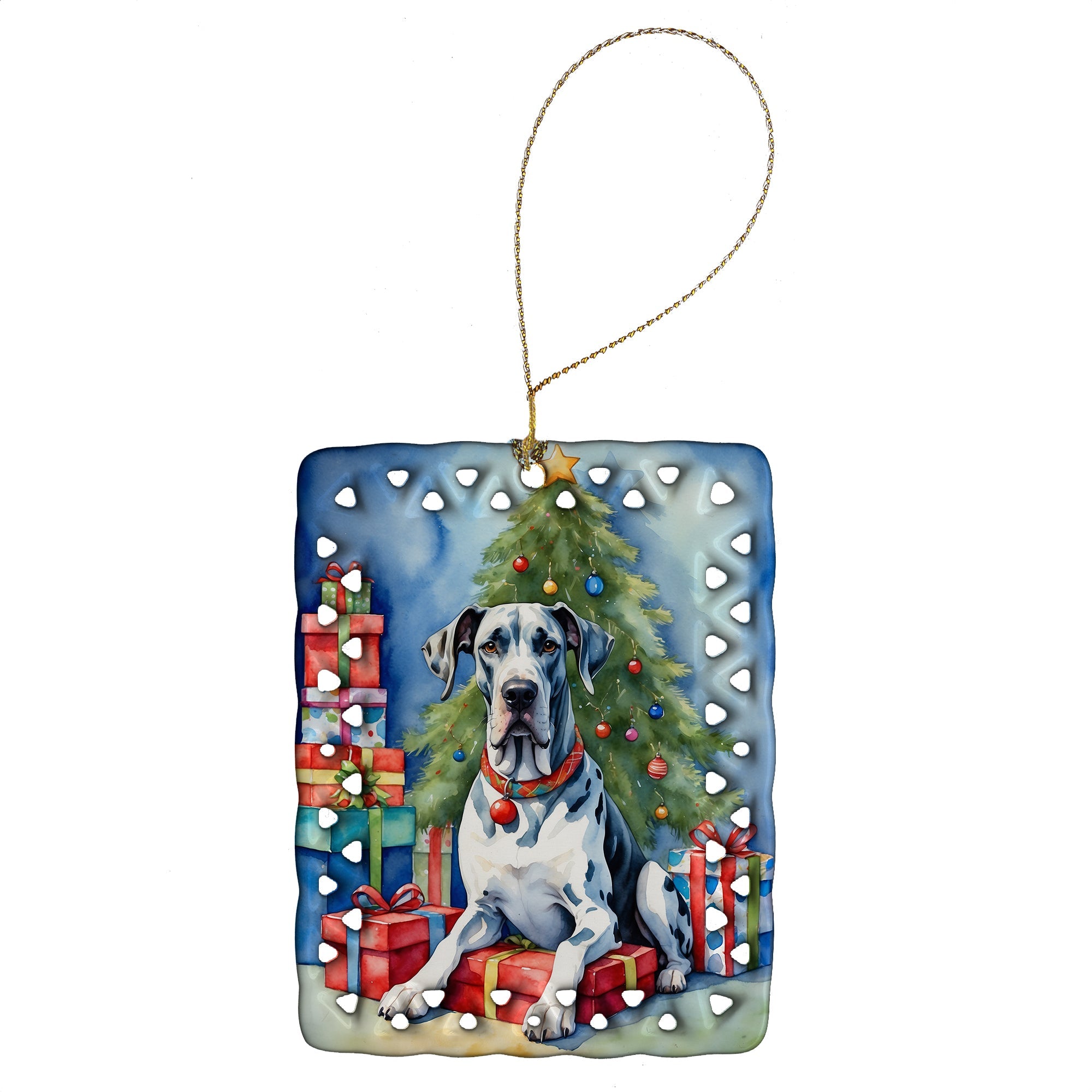 Porcelain Ornament featuring breed specific Great Dane artwork. Celebrate Christmas with this Christmas Ornament. Add a unique, personal touch to your holiday decor with our Rectangular Lattice Porcelain Ornament. Perfect for creating cherished memories, this high-quality ornament shines under festive lights, reflecting warmth and joy throughout your Christmas tree. Crafted with a glossy finish, it showcases vibrant, full-color artwork contributed by our talented artists, ensuring your tree is adorned with a burst of color and holiday spirit. What sets this Porcelain Ornament apart is its customizable white back. Use a paint pen or permanent marker to write a heartfelt message, commemorate a special year, or mark an unforgettable date, turning this ornament into a keepsake that will be treasured for years to come. For best results, allow any personalization to dry thoroughly before handling. Each ornament comes complete with a delicate gold cord, making it easy to hang and display. Proudly made in the USA, this ornament measures 3.375 x 2.625 inches and is a thoughtful gift for pet sitters, teachers, family members, or anyone who would appreciate a little extra holiday magic. Bring style, charm, and a touch of personal meaning to your Christmas tree with this beautifully designed ornament..