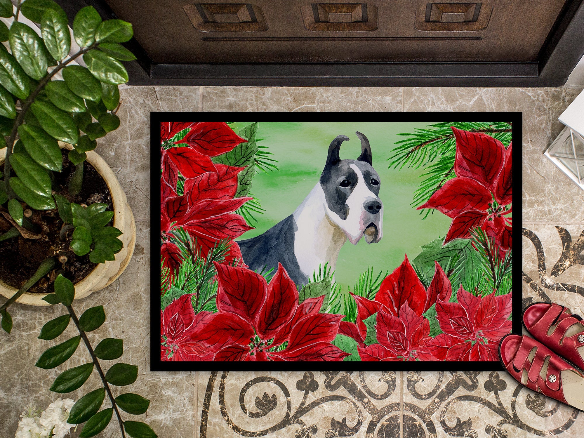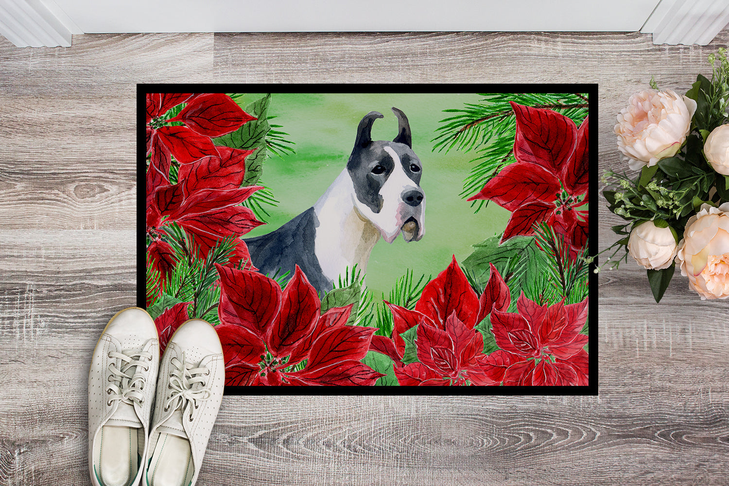 Decorate your space with our Great Dane artwork on a Doormat. Welcome your guests in style with our Artwork Door Mat, designed to withstand almost any weather condition. This mat, measuring approximately 18 by 27 inches, is held together by durable black binding tape. Its top layer, composed of polyester felt, is dyed with the eye-catching image you see on the mat. A few layers below provide the mat with stability, while its rubber bottom is stamped to help prevent slipping and ensures safety. Our mat works wonderfully as both an indoor or outdoor door mat. For cleaning, simply hose it off with water or use a power washer - no need for any cleaner that produces suds. Avoid scrubbing with a brush, instead, opt for the vacuum on floor setting. Designed manufactured and printed in the USA, this mat is a perfect addition to your porch, outdoor kitchen, entryway, or any indoor space. Its unique design makes it a charming decorative rug that greets your guests and adds a stylish touch to your home decor.