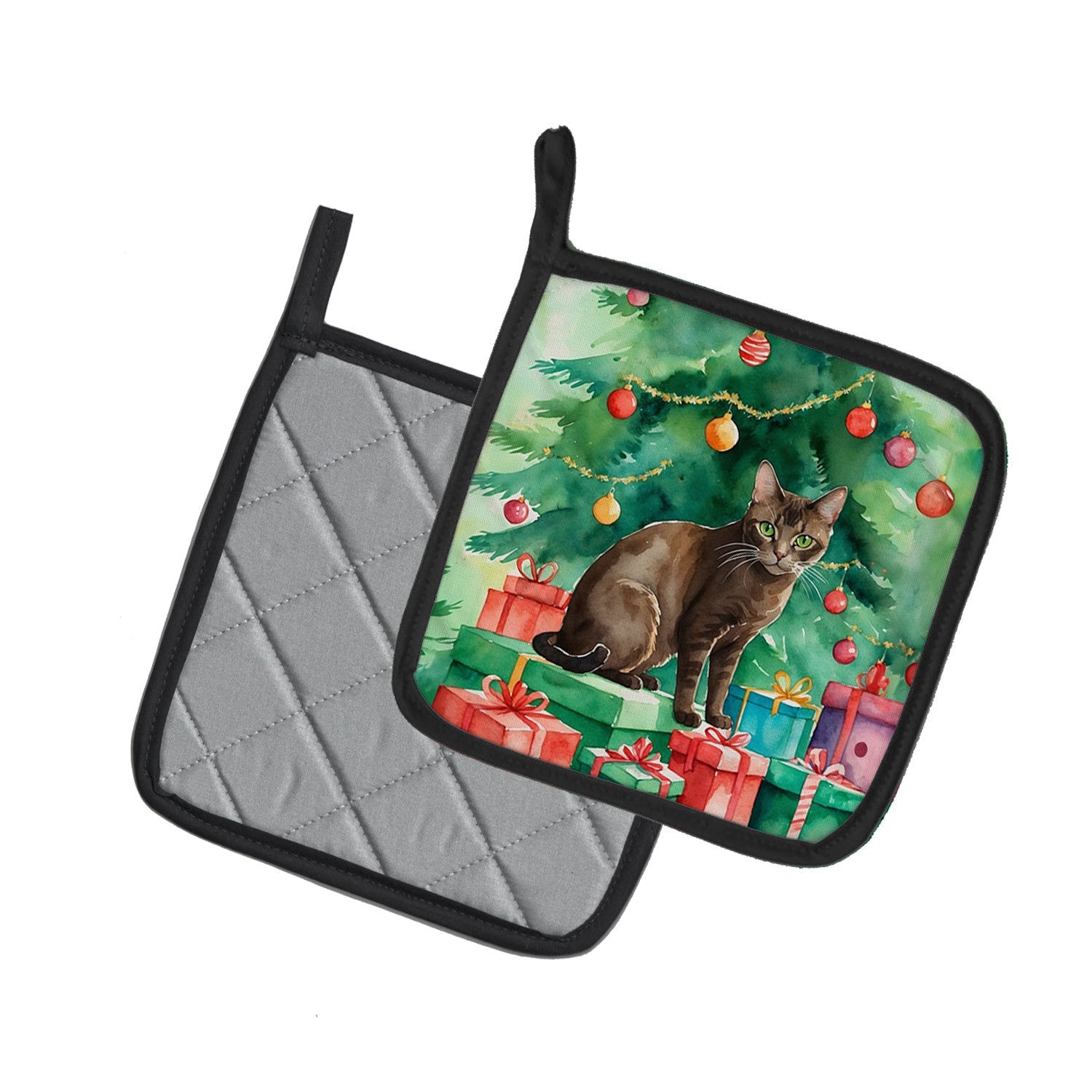 Pair of Pot Holders featuring breed specific Havana Brown artwork. Celebrate Christmas with this Christmas Pair of Pot Holders. A Pair of Pot Holders to match your kitchen decor. Made in the USA these are thick and functional. Full color artwork decorates the front polyester fabric of the hot pad and accented by a black trim. Use these at as a trivet for your Thanksgiving or Christmas tablescape. Filled with insulated fabric and quilted for durability. These colorful pot holders will make a great gift for your favorite home cook or executive chef. Each pot holder measures approximately 7 1/2 inches by 7 1/2 inches. A hanging tab is included.