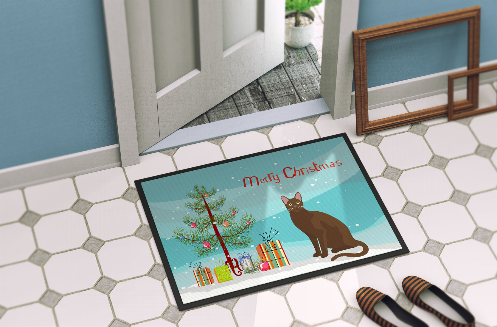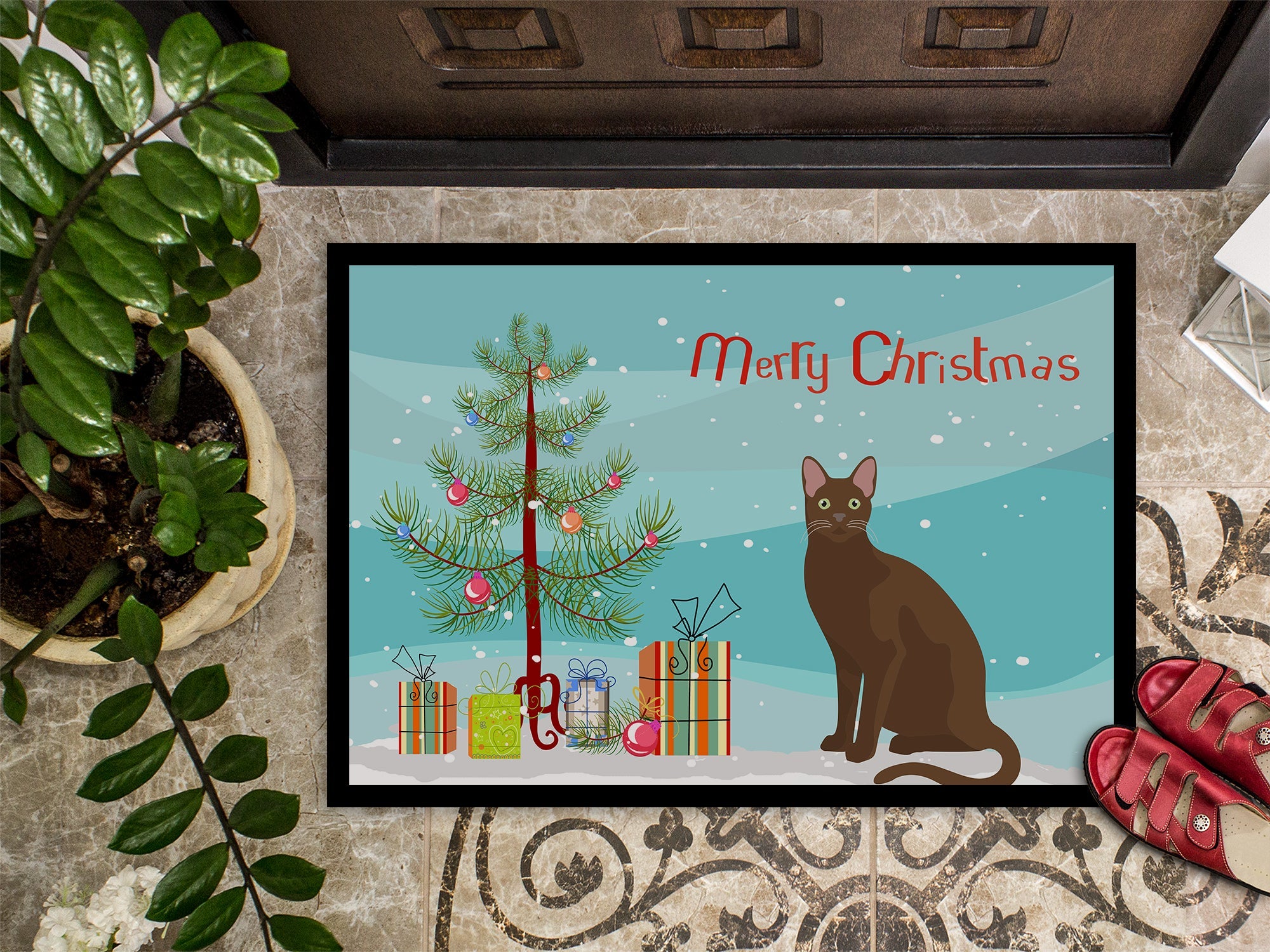 Decorate your space with our Christmas Havana Brown artwork on a Doormat. Welcome your guests in style with our Artwork Door Mat, designed to withstand almost any weather condition. This mat, measuring approximately 24 by 36 inches, is held together by durable black binding tape. Its top layer, composed of polyester felt, is dyed with the eye-catching image you see on the mat. A few layers below provide the mat with stability, while its rubber bottom is stamped to help prevent slipping and ensures safety. Our mat works wonderfully as both an indoor or outdoor door mat. For cleaning, simply hose it off with water or use a power washer - no need for any cleaner that produces suds. Avoid scrubbing with a brush, instead, opt for the vacuum on floor setting. Designed manufactured and printed in the USA, this mat is a perfect addition to your porch, outdoor kitchen, entryway, or any indoor space. Its unique design makes it a charming decorative rug that greets your guests and adds a stylish touch to your home decor.