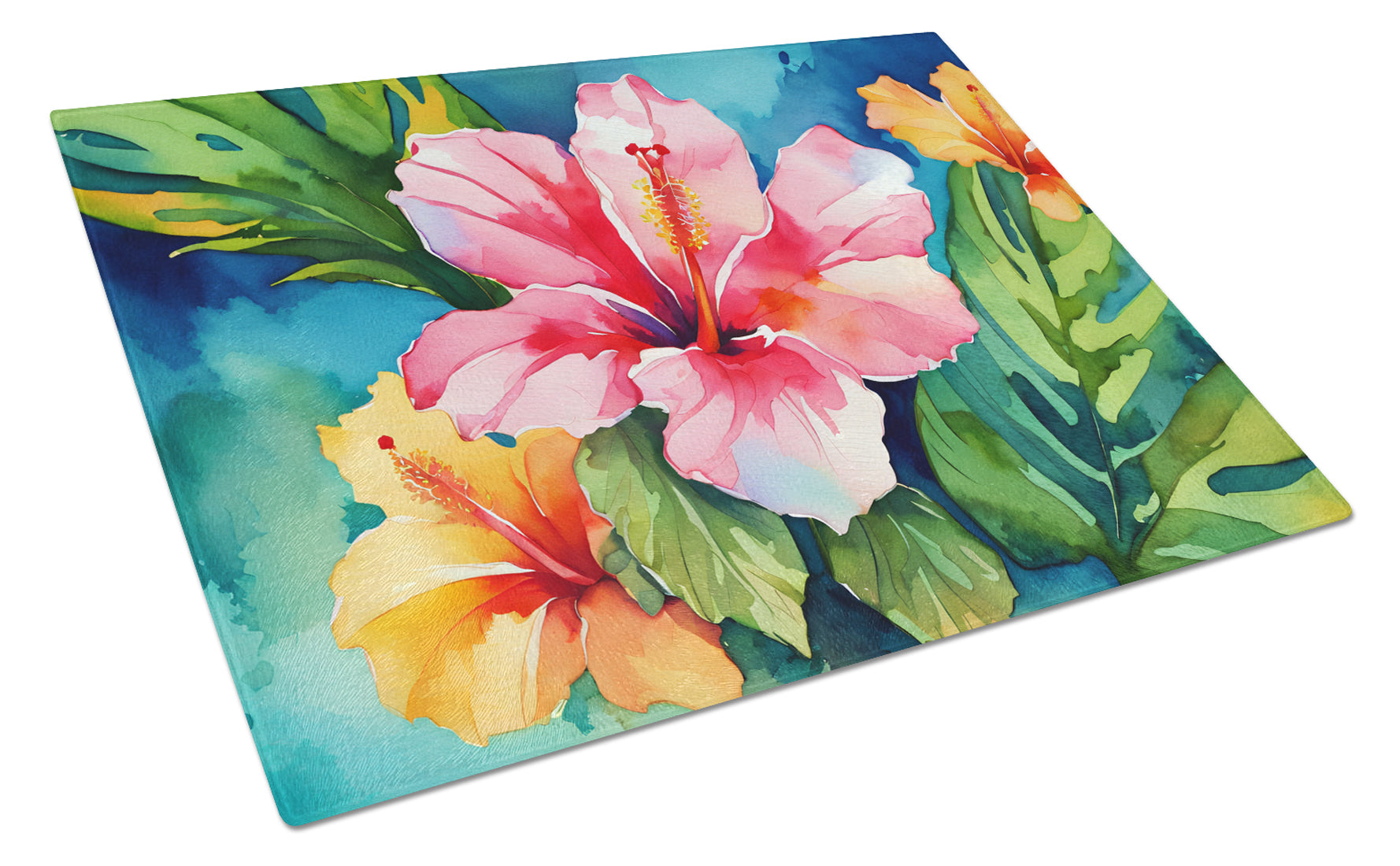 Decorate your space with our Hawaii Hawaiian Hibiscus artwork on a Cutting Board. Introduce your kitchen to the vibrant, large Decorative Glass Cutting Board from Caroline's Treasures. Crafted from resilient tempered glass, this board is not only a utilitarian necessity but also a colorful art piece. With its generous dimensions of 15 inches in height and 12 inches in length, it offers ample space for all your cutting needs. Every piece showcases captivating artwork from distinguished artists, bringing an aesthetic edge to your kitchen. Beyond its attractive design, this cutting board ensures your countertop stays pristine and unscathed, owing to its heat-resistant properties. Engineered with user convenience in mind, it features non-skid feet for stability, and rounded corners for additional safety. Its robust construction renders it virtually unbreakable, guaranteeing longevity. The board comes with protective feet bumpers, maintaining its position during use. This product is recommended to be hand washed only. Proudly printed and assembled in the United States, this cutting board exemplifies superior craftsmanship. With Caroline's Treasures' Decorative Glass Cutting Board, you're investing in a blend of functionality and artistic flair.
