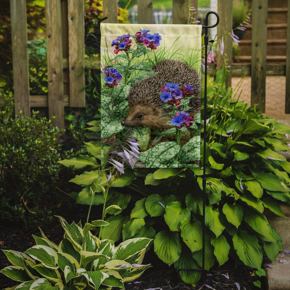 Decorate your space with our Hedgehog artwork on a Garden Flag. Enhance the beauty of your garden, patio, or yard with Caroline's Treasures Decorative Garden Flag, proudly made in the USA. Crafted from two pieces of thick, double-sided polyester fabric, this 2-ply garden flag is designed to withstand various weather conditions, making it water-resistant and weatherproof. Featuring correctly readable words on both sides, this garden flag offers a delightful visual experience from any angle. With its heavier weight, it stands out among other garden flags, ensuring stability and durability even in wind, rain, and snow. Measuring approximately 11 1/4 inches by 15 1/2 inches, this flag allows you to personalize your outdoor decor. It comes with a 1 1/2-inch sleeve sewn in, allowing easy attachment to any standard garden flag stand or garden size porch hanger (sold separately). Make a statement in your outdoor space with Caroline's Treasures Decorative Garden Flag, a vibrant and high-quality flag that adds color and personality to your surroundings. Proudly made in the USA, it's a symbol of quality craftsmanship and attention to detail.
