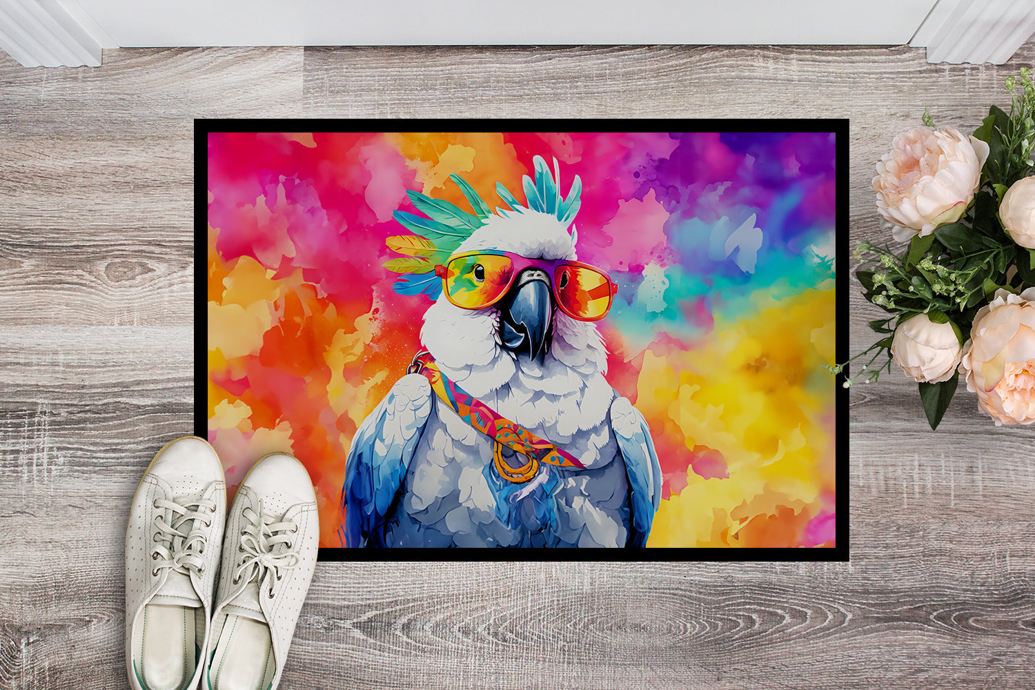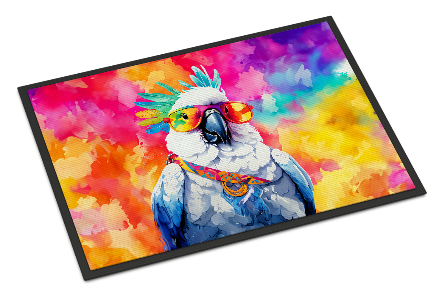 Decorate your space with our Cockatoo artwork on a Doormat. Bring a bit of Summer into your home with a Summer Doormat. Welcome your guests in style with our Artwork Door Mat, designed to withstand almost any weather condition. This mat, measuring approximately 24 by 36 inches, is held together by durable black binding tape. Its top layer, composed of polyester felt, is dyed with the eye-catching image you see on the mat. A few layers below provide the mat with stability, while its rubber bottom is stamped to help prevent slipping and ensures safety. Our mat works wonderfully as both an indoor or outdoor door mat. For cleaning, simply hose it off with water or use a power washer - no need for any cleaner that produces suds. Avoid scrubbing with a brush, instead, opt for the vacuum on floor setting. Designed manufactured and printed in the USA, this mat is a perfect addition to your porch, outdoor kitchen, entryway, or any indoor space. Its unique design makes it a charming decorative rug that greets your guests and adds a stylish touch to your home decor.
