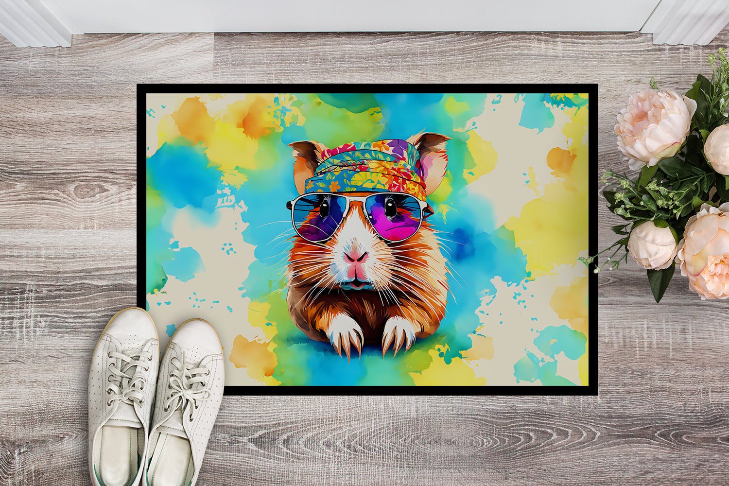 Decorate your space with our Guinea Pig artwork on a Doormat. Bring a bit of Summer into your home with a Summer Doormat. Welcome your guests in style with our Artwork Door Mat, designed to withstand almost any weather condition. This mat, measuring approximately 24 by 36 inches, is held together by durable black binding tape. Its top layer, composed of polyester felt, is dyed with the eye-catching image you see on the mat. A few layers below provide the mat with stability, while its rubber bottom is stamped to help prevent slipping and ensures safety. Our mat works wonderfully as both an indoor or outdoor door mat. For cleaning, simply hose it off with water or use a power washer - no need for any cleaner that produces suds. Avoid scrubbing with a brush, instead, opt for the vacuum on floor setting. Designed manufactured and printed in the USA, this mat is a perfect addition to your porch, outdoor kitchen, entryway, or any indoor space. Its unique design makes it a charming decorative rug that greets your guests and adds a stylish touch to your home decor.