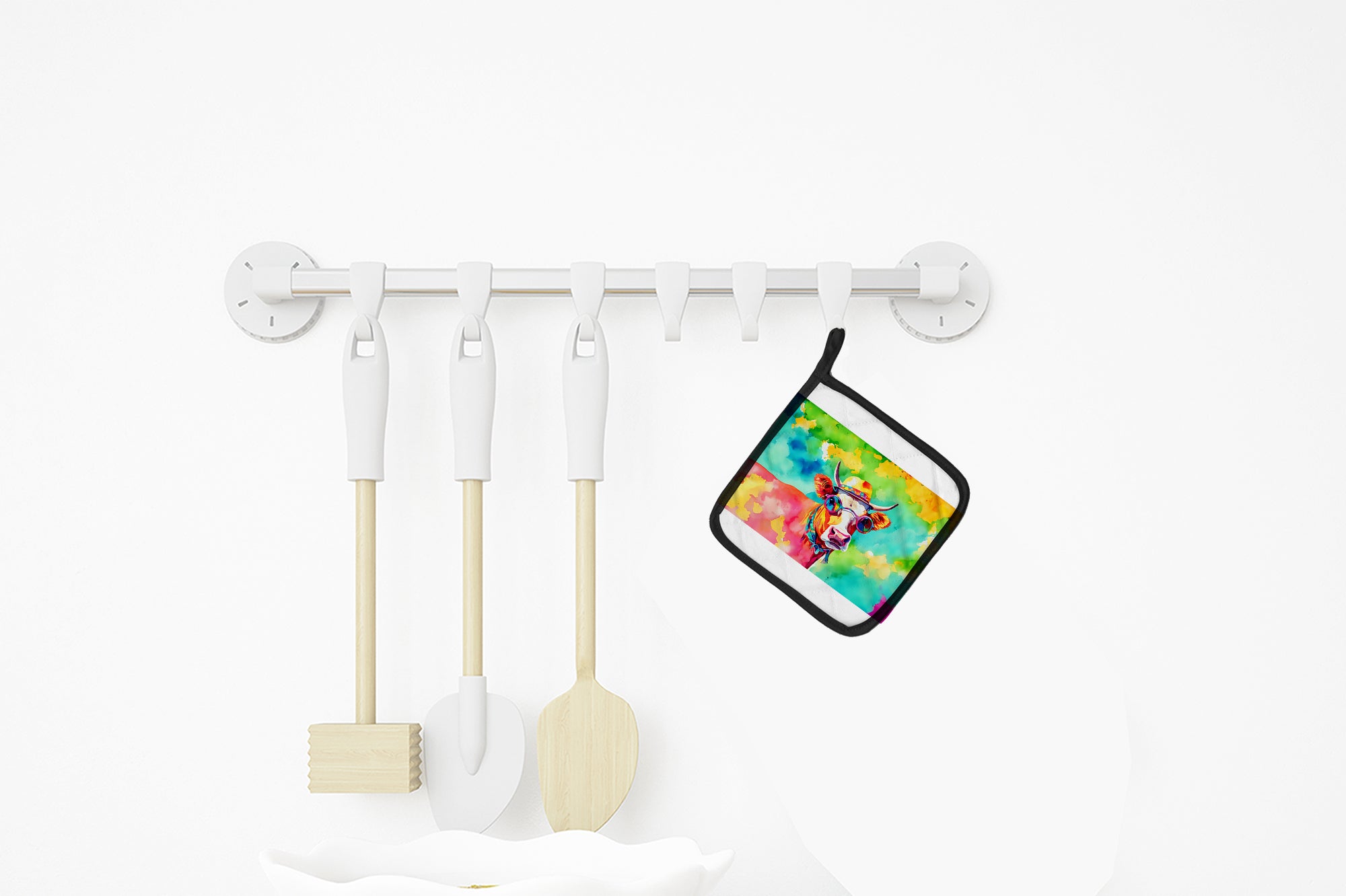 Decorate your space with our Malvi Cow artwork on a Pair of Pot Holders. Bring a bit of Summer into your home with a Summer Pair of Pot Holders. A Pair of Pot Holders to match your kitchen decor. Made in the USA these are thick and functional. Full color artwork decorates the front polyester fabric of the hot pad and accented by a black trim. Use these at as a trivet for your Thanksgiving or Christmas tablescape. Filled with insulated fabric and quilted for durability. These colorful pot holders will make a great gift for your favorite home cook or executive chef. Each pot holder measures approximately 7 1/2 inches by 7 1/2 inches. A hanging tab is included.