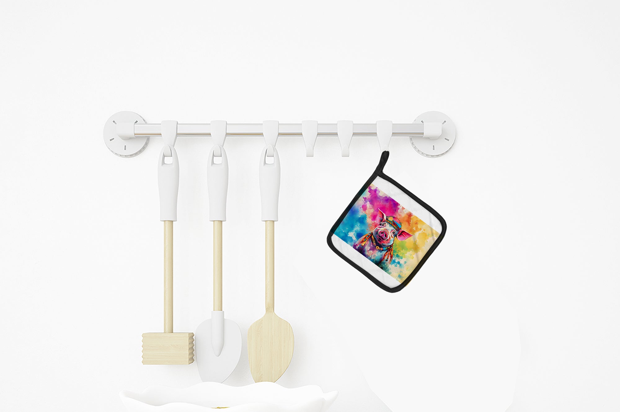 Decorate your space with our Pig artwork on a Pair of Pot Holders. Bring a bit of Summer into your home with a Summer Pair of Pot Holders. A Pair of Pot Holders to match your kitchen decor. Made in the USA these are thick and functional. Full color artwork decorates the front polyester fabric of the hot pad and accented by a black trim. Use these at as a trivet for your Thanksgiving or Christmas tablescape. Filled with insulated fabric and quilted for durability. These colorful pot holders will make a great gift for your favorite home cook or executive chef. Each pot holder measures approximately 7 1/2 inches by 7 1/2 inches. A hanging tab is included.