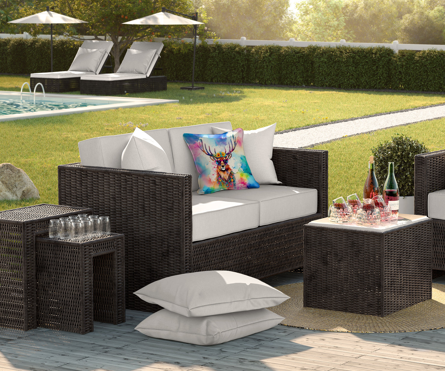 Decorate your space with our Deer artwork on a Pillow. Bring a bit of Summer into your home with a Summer Pillow. Revitalize your outdoor or indoor living space with Caroline's Treasures 18x18 Fabric Decorative Pillow. With a generously sized dimension of approximately 18 inches by 18 inches, this pillow makes a comfortable and aesthetic addition to any seating area. Made from a unique, water-resistant material developed by Caroline's Treasures, the pillow sham is 100% polyester fabric that's durable and ready to weather any condition. Its vibrant, full-color artwork will not fade over time as it is dyed with color-fast dyes. Whether you place it on your patio furniture, porch, veranda, or indoor couch, its soft canvas fabric ensures a cozy experience. The pillow is handcrafted in the United States, featuring a sham created from three pieces of fabric and a polyester insert for enduring shape and overstuffed comfort. Despite being robustly built to endure the outdoors, it is as soft and snug as your favorite indoor cushions. Please note, as all our pillows are handmade, sizes may vary slightly, adding to the charm of this unique decorative item.