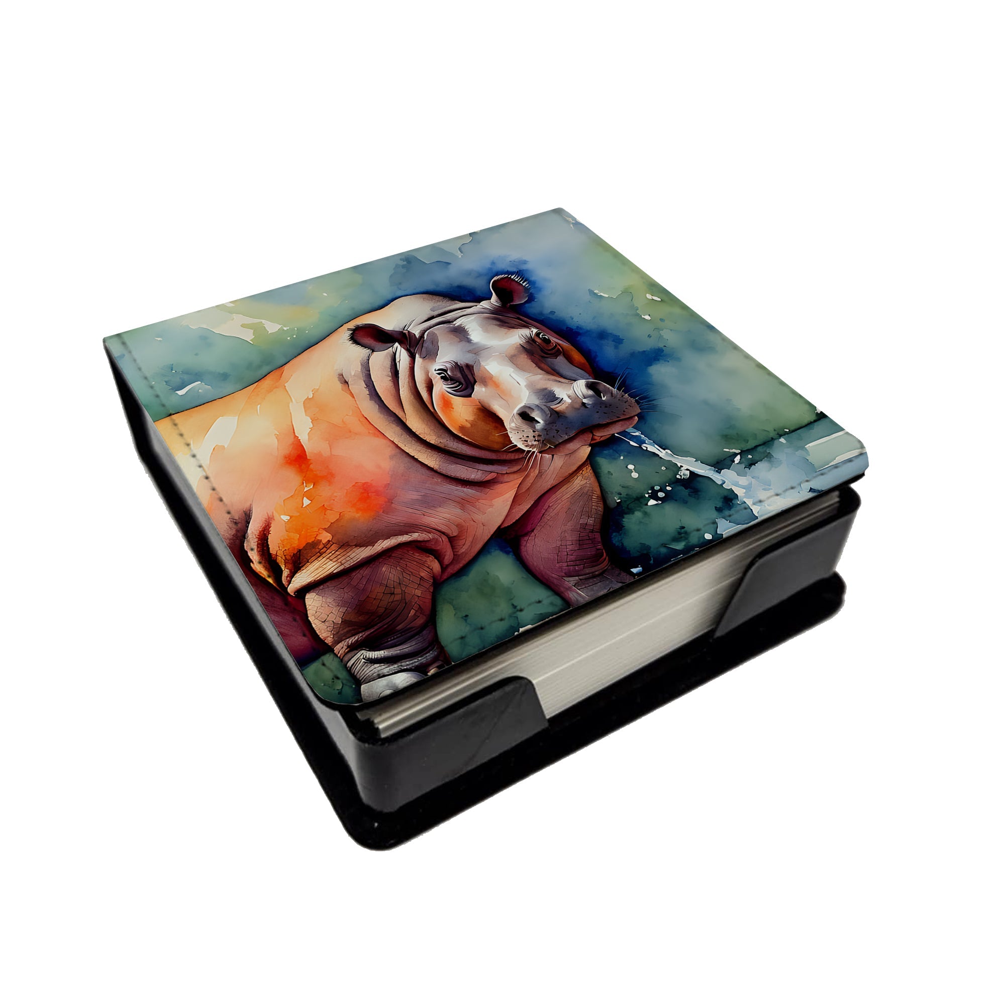 PU Leather Note Paper Holder featuring breed specific Hippopotamus artwork. Elevate your workspace with this PU Leather Note Paper Holder, crafted to resemble luxurious leather without the use of animal products. Made from durable synthetic PU leather, it offers both a premium look and eco-friendly appeal. This note holder, compactly sized at 4.25 x 4.25 x 1.25 inches, includes about 160 sheets of 3.75 x 3.75-inch note paper—ideal for quick notes and reminders. An exclusive artist-designed cover makes each holder uniquely vibrant, adding a splash of color and personality to any desk or office. The discrete design keeps note paper hidden, maintaining a neat and organized workspace. Perfect as a gift or for personal use, this stylish holder is refillable with standard paper, ensuring long-lasting utility. A must-have for anyone seeking a sophisticated, artful touch to their workspace while supporting animal-friendly products. Add style, organization, and creativity to your everyday routine with this elegant note paper holder.